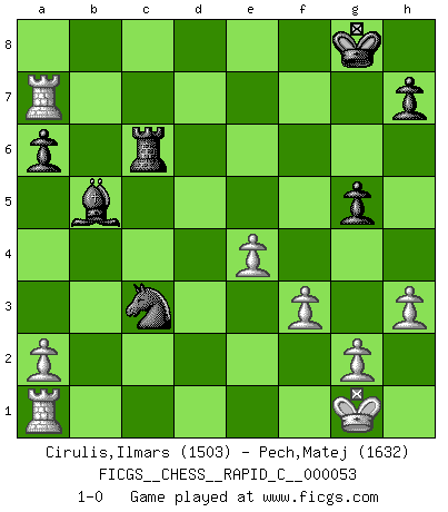 Last move : 1-0 2008 October 12 23:21:23 [Event "FICGS__CHESS__RAPID_C__000053"] [Site "FICGS"] [Date "2008.06.23"] [Round "1"] [White "Cirulis,Ilmars"] [Black "Pech,Matej"] [Result "1-0"] [WhiteElo "1503"] [BlackElo "1632"] 1.d4 Nf6 2.c4 c5 3.d5 b5 4.cxb5 a6 5.e3 g6 6.Nc3 Bg7 7.Nf3 O-O 8.Qb3 d6 9.b6 Bb7 10.Bc4 Nbd7 11.Na4 e6 12.dxe6 d5 13.exf7+ Rxf7 14.Be2 Ne4 15.O-O c4 16.Qc2 Bc6 17.Nc3 Ndc5 18.Nxe4 Nxe4 19.Bd2 Qxb6 20.Bc3 Bxc3 21.bxc3 Qa5 22.Ne5 Ba4 23.Nxc4 Qb5 24.Qd3 Qxc4 25.Qxc4 dxc4 26.Bxc4 Rc8 27.Bxf7+ Kxf7 28.Rfb1 Nxc3 29.Rb7+ Kg8 30.Ra7 Bb5 31.f3 g5 32.h3 Rc6 33.e4 1-0 This chess game has been lost on time (started : 2008.06.23 1:8:51) Benko gambit half accepted Kingside Castling by player Black (move 7) Kingside Castling by player White (move 15) Player White won this chess game. Follow this game move after move (download)Castle early and often. (Rob Sillars) Garry Kasparov war erst in der Großmeister-Organisation GMA, dann in der Profischach-Vereinigung PCA, zum Schluss kehrte er wieder in den Schoß der FIDE zurück. Aber gut, manche Leute sind flexibel (Viswanathan Anand) Repentinamente, me resultaba obvio en mi analisis que yo había pasado por alto lo que Fischer había visto en el tablero con la mas grande facilidad. (Mikhail Botvinnik) Un journaliste : 'Vous préférez avoir une dame de plus sur l'échiquier ou au lit ?' Boris Spassky : 'Ca dépend de la position.' Warrior pose battles inner weakness and wins focus. You see that there is no war within you. You're on your own side, and you are your own strength. (Terri Guillemets)