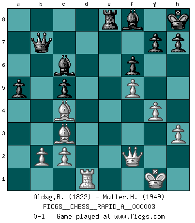 Last move : 0-1 2006 November 10 21:59:49 [Event "FICGS__CHESS__RAPID_A__000003"] [Site "FICGS"] [Date "2006.07.21"] [Round "1"] [White "Aldag,Benjamin"] [Black "Muller,Henri-Louis"] [Result "0-1"] [WhiteElo "1822"] [BlackElo "1949"] 1.e4 c5 2.Nc3 Nc6 3.f4 e6 4.Nf3 d5 5.Bb5 Nge7 6.exd5 exd5 7.Qe2 Qd6 8.Ne5 f6 9.Nxc6 bxc6 10.Ba4 Kf7 11.O-O Nf5 12.d3 Be7 13.Re1 Rb8 14.Bb3 Nd4 15.Qf2 Bf5 16.Ne2 Nxe2+ 17.Qxe2 Rhe8 18.Be3 Kg8 19.Qf3 Qd7 20.Qf2 Qd6 21.h3 a5 22.g4 Bd7 23.f5 Qc7 24.Kg2 Qa7 25.Bf4 Rbd8 26.a4 Bf8 27.Qg3 Kh8 28.Rab1 Qb7 29.Qf2 Qa7 30.Rbd1 Qb7 31.Bd2 c4 32.dxc4 dxc4 33.Bxc4 c5 34.Kg1 Bxa4 35.Bc3 Rxd1 36.Rxd1 Bc6 0-1 This chess game has been lost on time (started : 2006.07.21 10:12:50) Sicilian : Grand Prix attack Kingside Castling by player White (move 11) Player Black won this chess game. Follow this game move after move (download)Chess demands total concentration. (Bobby Fischer) Ich las kürzlich ein Buch von Nietzsche. Er sagte Religion verdumme nur die Menschen. Ich stimme zu. (Robert James Fischer) El Ajedrez es una hermosa aventura. (Bent Larsen) J'apprécie les joueurs d'est-indienne, c'est grâce à eux que je nourris ma famille depuis tant d'années. (Petrosian) Never was anything great achieved without danger. (Niccolo Machiavelli)