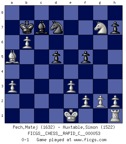 Last move : 0-1 2008 September 28 2:44:50 [Event "FICGS__CHESS__RAPID_C__000053"] [Site "FICGS"] [Date "2008.06.23"] [Round "1"] [White "Pech,Matej"] [Black "Huxtable,Simon"] [Result "0-1"] [WhiteElo "1632"] [BlackElo "1522"] 1.c4 e5 2.Nc3 f5 3.d4 exd4 4.Qxd4 Nc6 5.Qe3+ Qe7 6.Nf3 Qxe3 7.Bxe3 Bb4 8.Bd2 d6 9.Nd5 Bc5 10.Nxc7+ Kd7 11.Nxa8 Nf6 12.e3 a6 13.a3 Kd8 14.b4 Ba7 15.b5 axb5 16.cxb5 Ne7 17.Ba5+ Kd7 18.b6 Bb8 19.Bb5+ Kd8 20.Ng5 Rf8 21.Nc7 Bd7 22.Nce6+ Ke8 23.Nxg7+ Kd8 24.N5e6+ Kc8 25.Rc1+ Nc6 26.Nxf8 d5 27.Nxd7 Nxd7 28.Bxc6 bxc6 29.Rxc6+ Kb7 30.Rc7+ Bxc7 0-1 English Opening Player Black won this chess game. Follow this game move after move (download)Botvinnik tried to take the mystery out of Chess, always relating it to situations in ordinary life. He used to call Chess a typical inexact problem similar to those which people are always having to solve in everyday life. (Garry Kasparov) Deine Wertungszahl - vorausgesetzt einige Jahre schachliche Anstrengung - entspricht etwa dem zehnfachen Deines IQ plus 1000. (Jonathan Levitt) Siempre es mucho mejor sacrificar las piezas de tu oponente. (Savielly Tartakover) Il n'y a pas de prix trop élevé au scalp de l'ennemi. (Koblentz) I'm extremely disappointed. I send you out for exciting, new designer drugs, you come back with tomato sauce. (Gregory House, House M.D.)