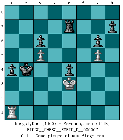 Last move : 0-1 2008 October 30 7:19:47 [Event "FICGS__CHESS__RAPID_D__000007"] [Site "FICGS"] [Date "2008.06.23"] [Round "1"] [White "Gurgui,Dan"] [Black "Marques,Joao"] [Result "0-1"] [WhiteElo "1400"] [BlackElo "1415"] 1.e4 e5 2.f4 Qh4+ 3.g3 Qe7 4.Nf3 exf4 5.Qe2 fxg3 6.hxg3 d6 7.d3 Bg4 8.Bf4 Nc6 9.c3 O-O-O 10.Bg2 Nf6 11.Bh3 Kb8 12.Bxg4 Nxg4 13.Nbd2 Re8 14.Nh4 Qd7 15.Nf5 Nf6 16.O-O-O d5 17.Nh4 dxe4 18.Nxe4 Nxe4 19.dxe4 Qe7 20.e5 f6 21.Nf5 Qe6 22.Nd4 Nxd4 23.Rxd4 Bd6 24.Re1 Qxa2 25.Qc4 Qxc4 26.Rxc4 Bxe5 27.Bxe5 Rxe5 28.Rxe5 fxe5 29.Kd2 Kc8 30.Rg4 g6 31.Rg5 Re8 32.Ke3 Kd7 33.Ke4 Kd6 34.b4 b6 35.c4 c6 36.Rg4 a6 37.Rh4 Re7 38.Rh1 a5 39.Rd1+ Kc7 40.bxa5 bxa5 41.Ra1 Kb6 42.c5+ Kb5 43.g4 a4 44.g5 Kb4 45.Ke3 e4 0-1 KGD : Keene's defense Queenside Castling by player Black (move 9) Queenside Castling by player White (move 16) Player Black won this chess game. Follow this game move after move (download)Up to this point White has been following well-known analysis. But now he makes a fatal error: he begins to use his own head. (Siegbert Tarrasch) Ihnen, Herr Lasker, habe ich nur drei Worte zu sagen: Schach und matt. (Siegbert Tarrasch) Cuando tengas duda... ¡juega al Ajedrez!. (Tevis) Les Cavaliers se révèlent fort utiles dans les positions fermées. D'habitude, les Fous sont un peu plus forts que les Cavaliers dans les positions ouvertes. Qu'on le veuille ou non, il restera toujours des exceptions ! No, no, you're not thinking; you're just being logical. (Niels Bohr)