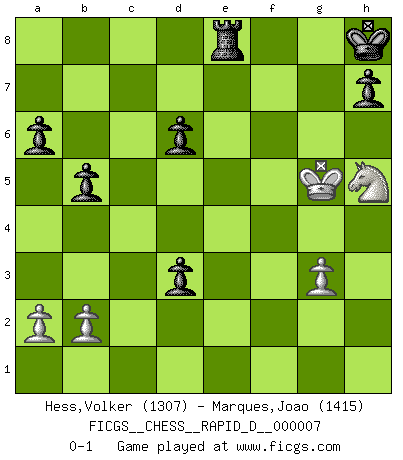 Last move : 0-1 2008 July 21 14:26:32 [Event "FICGS__CHESS__RAPID_D__000007"] [Site "FICGS"] [Date "2008.06.23"] [Round "1"] [White "Hess,Volker"] [Black "Marques,Joao"] [Result "0-1"] [WhiteElo "1307"] [BlackElo "1415"] 1.e4 e5 2.Nf3 Nc6 3.Bb5 Nf6 4.O-O d6 5.Re1 Bd7 6.c3 Be7 7.d4 exd4 8.cxd4 O-O 9.Nc3 a6 10.Ba4 b5 11.Bc2 Bg4 12.Bg5 Bxf3 13.Qxf3 Nxd4 14.Qd3 Nxc2 15.Qxc2 c5 16.Bxf6 Bxf6 17.Nd5 Bd4 18.Qe2 Re8 19.Rab1 f5 20.Qh5 fxe4 21.Nf4 e3 22.Qd5+ Kh8 23.Rf1 exf2+ 24.Rxf2 Bxf2+ 25.Kxf2 Qh4+ 26.g3 Qxh2+ 27.Kf3 Qh6 28.Re1 Qf6 29.Rxe8+ Rxe8 30.Kg4 g5 31.Nh5 Qd4+ 32.Qxd4+ cxd4 33.Kxg5 d3 0-1 Ruy Lopez : Berlin defense, 4.O-O, d6 Kingside Castling by player White (move 4) Kingside Castling by player Black (move 8) Player Black won this chess game. Follow this game move after move (download)No other master has such a terrific will to win. At the board he radiates danger, and even the strongest opponents tend to freeze, like rabbits when they smell a panther. Even his weaknesses are dangerous. As white, his opening game is predictable - you can make plans against it - but so strong that your plans almost never work. In the middle game his precision and invention are fabulous, and in the end game you simply cannot beat him. (Anonymous German Expert) Nicht daß Diemer aus Opportunismus Mitglied der NSDAP geworden wäre. Er war ein Fanatiker, in allem, was er tat. (Hans Ree) No hay precio que no valga la pena por la cabellera del Rey enemigo. (Koblentz) Les échecs sont un jeu terrible. Si vous n'avez pas le centre, votre adversaire a une position plus libre. Par contre, si vous avez le centre, alors vous avez vraiment quelque chose pour laquelle vous inquiéter ! (Siegbert Tarrasch) You think that education is too expensive ? Try ignorance. (Derek Bok)