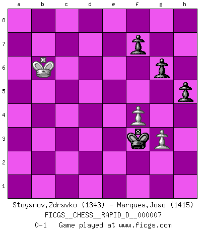 Last move : 0-1 2008 August 5 19:54:33 [Event "FICGS__CHESS__RAPID_D__000007"] [Site "FICGS"] [Date "2008.06.23"] [Round "1"] [White "Stoyanov,Zdravko"] [Black "Marques,Joao"] [Result "0-1"] [WhiteElo "1343"] [BlackElo "1415"] 1.e4 e5 2.Nf3 Nc6 3.a3 Nf6 4.d3 Be7 5.Be2 O-O 6.O-O d5 7.exd5 Nxd5 8.Bd2 a6 9.Nc3 Bg4 10.Re1 b5 11.Nxe5 Nxc3 12.Bxc3 Nxe5 13.Bxe5 Be6 14.Bf3 Rc8 15.Bb7 Rb8 16.Bxa6 Rb6 17.Bxb5 Rxb5 18.c4 Rb7 19.b4 Bf6 20.Bxf6 Qxf6 21.d4 Bxc4 22.Rc1 Bd5 23.Rc5 c6 24.f3 R7b8 25.Re5 Rfe8 26.Qe1 Rxe5 27.dxe5 Qf4 28.Ra5 g6 29.Qe2 Qd4+ 30.Qf2 Qxe5 31.g3 Qa1+ 32.Kg2 Qa2 33.Ra6 Qxf2+ 34.Kxf2 Kg7 35.f4 Rb7 36.Ke3 h5 37.Kd4 Kf6 38.Kc5 Kf5 39.Ra5 Bg2 40.a4 Kg4 41.b5 cxb5 42.axb5 Kh3 43.b6 Kxh2 44.Ra3 Kh3 45.Kb5 Kg4 46.Ka6 Bf3 47.Rxf3 Rxb6+ 48.Kxb6 Kxf3 0-1 King's pawn game Kingside Castling by player Black (move 5) Kingside Castling by player White (move 6) 10 pieces endgame at move 47 : White KRPPP , Black KRPPP WHITE : King + 1 Rook 3 Pawns BLACK : King + 1 Rook 3 Pawns 9 pieces endgame at move 47 : White KRPP , Black KRPPP WHITE : King + 1 Rook 2 Pawns BLACK : King + 1 Rook 3 Pawns 8 pieces endgame at move 48 : White KRPP , Black KPPP WHITE : King + 1 Rook 2 Pawns BLACK : King + 3 Pawns 7 pieces endgame at move 48 : White KPP , Black KPPP WHITE : King + 2 Pawns BLACK : King + 3 Pawns Player Black won this chess game. Follow this game move after move (download)Play the opening like a book, the middle game like a magician, and the endgame like a machine. (Spielmann) Die Partien sind immer verschieden, die Interviews immer die gleichen. (Garry Kasparov) Las combinaciones han sido siempre el aspecto más intrigante del Ajedrez. Los Maestros las buscan, el público las aplauden, los críticos las alaban. La razón se debe a que las combinaciones hacen posible que el Ajedrez sea más que un ejercicio matemático con una carencia de vida. Ellas son la poesía del juego, son del Ajedrez lo que la melodía es de la música. Ellas representan el triunfo de la mente sobre la materia. (Reuben Fine) Si je n'étais pas joueur d'échecs, je serais le meilleur dans quelque chose d'autre. (Anatoli Karpov) Men should grow up. - Yeah. And dogs should stop licking themselves. It's not gonna happen. (Gregory House to Dr. Cameron, House M.D.)