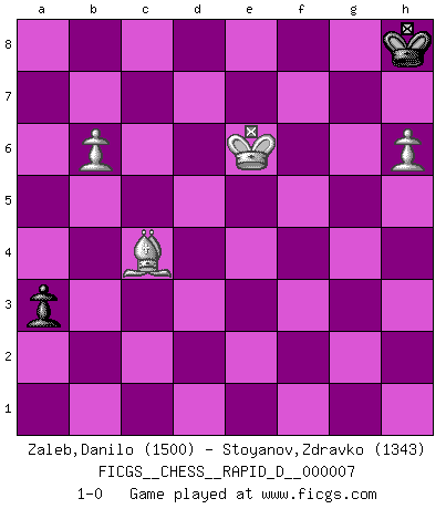 Last move : 1-0 2008 September 18 15:55:16 [Event "FICGS__CHESS__RAPID_D__000007"] [Site "FICGS"] [Date "2008.06.23"] [Round "1"] [White "Zaleb,Danilo"] [Black "Stoyanov,Zdravko"] [Result "1-0"] [WhiteElo "1500"] [BlackElo "1343"] 1.e4 e6 2.Nf3 b6 3.Bc4 Bb7 4.O-O Nf6 5.Nc3 Bb4 6.Ne2 Nxe4 7.c3 Bc5 8.d4 Be7 9.Re1 Nd6 10.Bb3 Bxf3 11.Qd2 Ne4 12.Qe3 Bxe2 13.Qxe4 Nc6 14.Qxe2 O-O 15.Qg4 Re8 16.Bh6 g6 17.d5 exd5 18.Bxd5 Bf6 19.Red1 Qe7 20.h3 Qe2 21.Qxd7 Ne5 22.Qa4 Rad8 23.Re1 Qxb2 24.c4 a5 25.Bc6 Re6 26.Bd5 Red6 27.f4 Qd4+ 28.Kh1 c6 29.fxe5 Bxe5 30.Rad1 Qc3 31.Bf3 Rxd1 32.Rxd1 Rxd1+ 33.Qxd1 Qd4 34.Qxd4 Bxd4 35.Bxc6 Bg7 36.Bxg7 Kxg7 37.a4 Kf6 38.Bd5 Kg7 39.Kh2 f5 40.Kg3 Kf6 41.Kf4 g5+ 42.Kf3 h6 43.g3 Ke5 44.Bf7 Kf6 45.Bh5 Ke5 46.Be8 Kd4 47.Bb5 Ke5 48.Ke3 f4+ 49.gxf4+ gxf4+ 50.Kf3 Kf5 51.h4 Ke5 52.Bd7 Kd4 53.Kxf4 Kxc4 54.Kf5 Kd5 55.Kg6 Kd6 56.Bb5 Ke7 57.Kxh6 Kf6 58.h5 Kf7 59.Kg5 Kg7 60.h6+ Kh7 61.Bd3+ Kg8 62.Kf6 Kh8 63.Ke6 b5 64.axb5 a4 65.Bc4 a3 66.b6 1-0 French defense Kingside Castling by player White (move 4) Kingside Castling by player Black (move 14) 10 pieces endgame at move 49 : White KBPPP , Black KPPPP WHITE : King + 1 Bishop 3 Pawns BLACK : King + 4 Pawns 9 pieces endgame at move 53 : White KBPPP , Black KPPP WHITE : King + 1 Bishop 3 Pawns BLACK : King + 3 Pawns 8 pieces endgame at move 53 : White KBPP , Black KPPP WHITE : King + 1 Bishop 2 Pawns BLACK : King + 3 Pawns 7 pieces endgame at move 57 : White KBPP , Black KPP WHITE : King + 1 Bishop 2 Pawns BLACK : King + 2 Pawns 6 pieces endgame at move 64 : White KBPP , Black KP WHITE : King + 1 Bishop 2 Pawns BLACK : King + 1 Pawn Player White won this chess game. Follow this game move after move (download)The tactician knows what to do when there is something to do; whereas the strategian knows what to do when there is nothing to do. (Gerald Abrahams) Gewöhnliche Menschen denken nur daran, wie sie ihre Zeit verbringen. Ein intelligenter Mensch versucht, sie auszunutzen. (Arthur Schopenhauer) Todo lo que importa ante el tablero de Ajedrez son buenas jugadas. (Bobby Fischer) Votre seul travail dans les ouvertures est d'obtenir un milieu de partie jouable. (Lajos Portish) The mind is like a parachute, it only functions when its open. (Unknown)