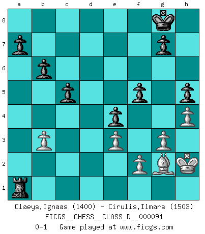 Last move : 0-1 2008 August 23 20:0:53 [Event "FICGS__CHESS__CLASS_D__000091"] [Site "FICGS"] [Date "2008.06.26"] [Round "1"] [White "Claeys,Ignaas"] [Black "Cirulis,Ilmars"] [Result "0-1"] [WhiteElo "1400"] [BlackElo "1503"] 1.Nf3 Nf6 2.g3 Nc6 3.c4 e5 4.Bg2 Bc5 5.O-O O-O 6.b3 d5 7.cxd5 Nxd5 8.Ba3 Bxa3 9.Nxa3 e4 10.Ne1 Qe7 11.Nc4 Bg4 12.Ne3 Nxe3 13.dxe3 Rad8 14.Qc2 f5 15.Qc4+ Rf7 16.Nc2 Ne5 17.Qb5 c6 18.Qa5 Bxe2 19.Rfe1 b6 20.Qc3 Bg4 21.Nd4 c5 22.Ne2 Nd3 23.Rad1 Nxe1 24.Rxd8+ Qxd8 25.Qxe1 Rd7 26.Nc3 Rd2 27.h3 Be2 28.Kh2 Qd3 29.Nxe2 Qxe2 30.Qxe2 Rxe2 31.Kg1 Rxa2 32.h4 Ra1+ 33.Kh2 h5 0-1 Reti Opening Kingside Castling by player White (move 5) Kingside Castling by player Black (move 5) Player Black won this chess game. Follow this game move after move (download)I still hope to kill Fischer. (Boris Spassky) Es liegt in der Natur, vernüftig zu denken und unlogisch zu handeln. (Anatole France) No hay precio que no valga la pena por la cabellera del Rey enemigo. (Koblentz) Si rien de grave n'est détecté lors de l'analyse d'une position, on joue alors le coup. Seconde règle de Blumenfeld. Beta. Software undergoes beta testing shortly before it's released. Beta is latin for still doesn't work. (Anonymous)