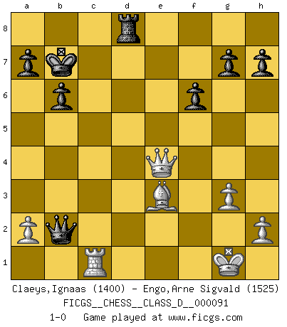 Last move : 1-0 2008 August 27 16:10:33 [Event "FICGS__CHESS__CLASS_D__000091"] [Site "FICGS"] [Date "2008.06.26"] [Round "1"] [White "Claeys,Ignaas"] [Black "Engo,Arne Sigvald"] [Result "1-0"] [WhiteElo "1400"] [BlackElo "1525"] 1.Nf3 b6 2.g3 Bb7 3.Bg2 d5 4.O-O Nd7 5.d4 e6 6.c4 Ne7 7.Nc3 c5 8.cxd5 Nxd5 9.Ne5 cxd4 10.Nxd5 Bc5 11.Nxd7 Qxd7 12.Nf4 Bxg2 13.Nxg2 e5 14.e3 O-O-O 15.exd4 Bxd4 16.Qf3 Kb8 17.Rd1 Bxf2+ 18.Kxf2 Qxd1 19.Qe4 f6 20.Nf4 Rd4 21.Qf5 e4 22.Ne2 Qc2 23.Bf4+ Kb7 24.Rc1 Qd3 25.Nxd4 Qxd4+ 26.Be3 Qxb2+ 27.Kg1 Rd8 28.Qxe4+ 1-0 Reti Opening Kingside Castling by player White (move 4) Queenside Castling by player Black (move 14) Player White won this chess game. Follow this game move after move (download)When the Chess game is over, the Pawn and the King go back to the same box. (Irish saying) Früher wurde jeder komplizierte Zug, jedes interessante Opfer mit großem Beifall und Enthusiasmus aufgenommen. Heute schaltet man einfach seinen Fritz an, und man kann sehen, was los ist, ob der Zug geht oder nicht. (Vladimir Kramnik) Los problemas de Ajedrez exigen del compositor las mismas virtudes que caracterizan todo el arte de valor: originalidad, invención, concisión, armonía, complejidad e insinceridad explendida. (Vladimir Nabokov) Soyez une menace à chaque fois que vous vous asseyez pour jouer. (Ken Smith) They say in chess you've got to kill the queen, and then you mate it... Oh I, do you ? (Red Hot Chili Peppers, Fortune faded)