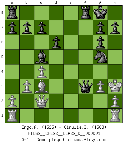 Last move : 0-1 2008 August 30 10:29:39 [Event "FICGS__CHESS__CLASS_D__000091"] [Site "FICGS"] [Date "2008.06.26"] [Round "1"] [White "Engo,Arne Sigvald"] [Black "Cirulis,Ilmars"] [Result "0-1"] [WhiteElo "1525"] [BlackElo "1503"] 1.c4 e5 2.Nc3 Nc6 3.g3 Bc5 4.Bg2 Nf6 5.e3 O-O 6.Nge2 d6 7.b3 Bf5 8.Bb2 Nb4 9.e4 Nd3+ 10.Kf1 Nxf2 11.Qc2 Bg6 12.d4 exd4 13.Nf4 dxc3 14.Bxc3 N6xe4 15.Nxg6 fxg6 16.Ke2 Qg5 17.Bxe4 Qe3+ 18.Kf1 Nxe4 19.Kg2 Qf3+ 20.Kh3 Ng5+ 0-1 English : Sicilian Reversed Kingside Castling by player Black (move 5) Player Black won this chess game. Follow this game move after move (download)When you see a good move, look for a better one. (Emanuel Lasker) Der Vorposten provoziert a) eine Basis für neue Angriffe und b) eine Schwächung der gegnerischen Widerstandskraft in der fraglichen Linie. (Aaron Nimzowitsch) Cuando estes solo, cuando te sientas un extraño en el mundo, juega al Ajedrez. Esto levantará tu espiritu y será tu consejero de guerra. (Aristóteles) On est toujours la mazette de quelqu'un d'autre. (Anonyme) Fear is the path to the dark side. Fear leads to anger; anger leads to hate; hate leads to suffering. I sense much fear in you. (Master Yoda in Star Wars ep.1)