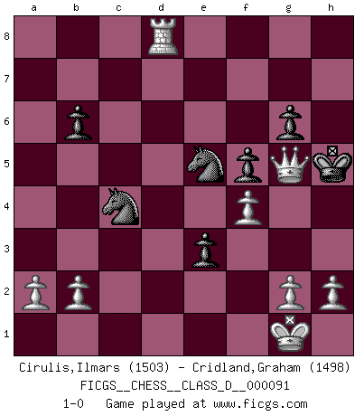 Last move : 1-0 2008 July 31 21:14:57 [Event "FICGS__CHESS__CLASS_D__000091"] [Site "FICGS"] [Date "2008.06.26"] [Round "1"] [White "Cirulis,Ilmars"] [Black "Cridland,Graham"] [Result "1-0"] [WhiteElo "1503"] [BlackElo "1498"] 1.d4 Nf6 2.c4 g6 3.Nc3 Bg7 4.e4 O-O 5.e5 Ne8 6.f4 b6 7.Nf3 Bb7 8.Bd3 d6 9.O-O c5 10.d5 e6 11.dxe6 fxe6 12.Ng5 Qe7 13.Nxh7 Rf5 14.Bxf5 exf5 15.Nd5 Bxd5 16.Qxd5+ Kxh7 17.Qxa8 Nd7 18.Qxa7 dxe5 19.Rd1 Nd6 20.Rd5 e4 21.Be3 Kh6 22.Rad1 Bd4 23.Bxd4 cxd4 24.R1xd4 e3 25.Re5 Nxe5 26.Qxe7 Ndxc4 27.Rd8 Kh5 28.Qg5+ 1-0 King's Indian : 4.e4 Kingside Castling by player Black (move 4) Kingside Castling by player White (move 9) Player White won this chess game. Follow this game move after move (download)Human affairs are like a Chess game: only those who do not take it seriously can be called good players. (Hung Tzu Ch'eng) Matt entspricht nicht immer den Tatsachen. (Savielly Grigorievitsch Tartakower) Las piezas de Ajedrez son los bloques del alfabeto que moldean los pensamientos; y esos pensamientos, aunque hagan un diseño visual en el tablero, expresan abstractamente su belleza como un poema. (Marcel Duchamp) Dieu déplace le joueur, et celui-ci la pièce. Quel Dieu derrière Dieu commence donc la trame ? Arturo Perez-Reverte (prix de littérature policière 1993). Do you know these so called Volunteers don't even get paid! (Simpsons)