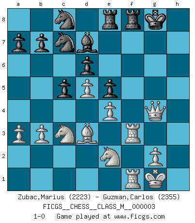 Last move : 1-0 2006 June 28 19:49:11 [Event "FICGS__CHESS__CLASS_M__000003"] [Site "FICGS"] [Date "2006.04.15"] [Round "1"] [White "Zubac,Marius"] [Black "Guzman,Carlos"] [Result "1-0"] [WhiteElo "2223"] [BlackElo "2355"] 1.d4 e6 2.c4 Nf6 3.Nc3 c5 4.d5 exd5 5.cxd5 d6 6.e4 g6 7.Bd3 Bg7 8.Nge2 O-O 9.O-O Ng4 10.h3 Ne5 11.Bc2 Na6 12.f4 Nc4 13.b3 Nb6 14.f5 Nb4 15.Bb1 Qe7 16.a3 Na6 17.Ra2 Bd7 18.Qe1 Be5 19.Bf4 f6 20.fxg6 hxg6 21.Bd3 Nc7 22.Ra1 Rae8 23.Qg3 Qg7 24.Rae1 Nc8 25.Rf3 g5 26.Bxe5 fxe5 27.Ref1 g4 28.hxg4 Qxg4 29.Qxg4 1-0 Queen's pawn Kingside Castling by player Black (move 8) Kingside Castling by player White (move 9) Player White won this chess game. Follow this game move after move (download)If a ruler does not understand Chess, how can he rule over a kingdom ? (King Khusros II) Pläne sind die Träume des Verständigen. (Ernst Freiherr von Feuchtersleben) Todavía soy una víctima del Ajedrez. Tiene toda la belleza del arte y mucho mas. No puede ser comercializado. El Ajedrez es mas puro que el arte en su posición social. (Marcel Duchamp) Les échecs c'est le défi de l'alpiniste, toujours plus haut, prêt à tout pour monter à l'assaut du Roi ennemi. Les échecs, c'est de la musique en mouvement, un ballet majestueux pour les yeux. C'est de la poésie composée par les fantômes du passé qui au même titre que Rimbaud ou Verlaine méritent notre admiration. Les échecs, c'est de la peinture ou le moindre mouvement modifie le tableau pour en faire un Picasso ou un Van Gogh. Les échecs, c'est tout et rien, c'est la vie et la mort. Jjulie33 sur le forum de France-Echecs. To err is human, but to really foul things up requires a computer. (Farmer's Almanac, 1978)