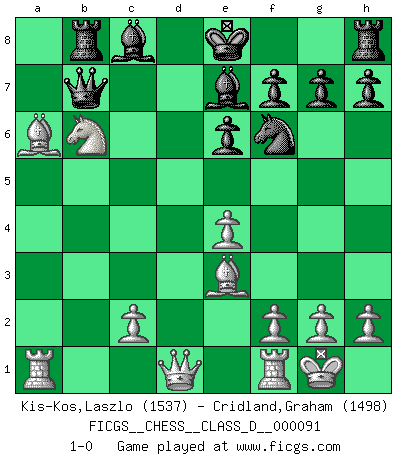 Last move : 1-0 2008 July 15 19:51:37 [Event "FICGS__CHESS__CLASS_D__000091"] [Site "FICGS"] [Date "2008.06.26"] [Round "1"] [White "Kis-Kos,Laszlo"] [Black "Cridland,Graham"] [Result "1-0"] [WhiteElo "1537"] [BlackElo "1498"] 1.e4 c5 2.Nf3 Nc6 3.d4 cxd4 4.Nxd4 e6 5.Nc3 Qc7 6.Be3 a6 7.Bd3 Nf6 8.O-O b5 9.Nxc6 dxc6 10.a4 Be7 11.axb5 cxb5 12.Nxb5 Qb8 13.Na3 Qxb2 14.Nc4 Qb7 15.Nb6 Rb8 16.Bxa6 1-0 Sicilian defense Kingside Castling by player White (move 8) Player White won this chess game. Follow this game move after move (download)The laws of Chess do not permit a free choice: you have to move whether you like it or not. (Emanuel Lasker) Moralische Siege zählen nicht. (Savielly Grigorievitsch Tartakower) El Ajedrez es un cuento de Hadas de las 1001 metidas de pata. (Savielly Tartakower) Les sacrifices démontrent seulement que quelqu'un a gaffé. (Savielly Tartacover) It's unlucky to be superstitious. (Dave Enteles)