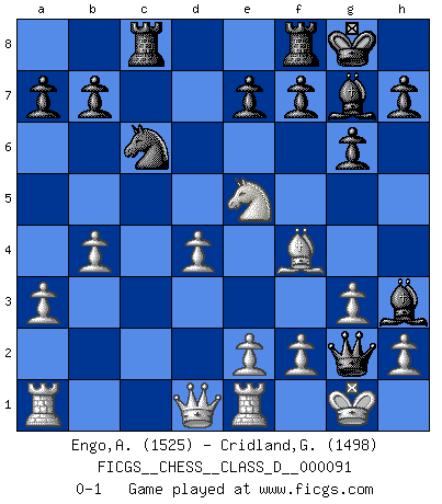 Last move : 0-1 2008 August 14 15:6:20 [Event "FICGS__CHESS__CLASS_D__000091"] [Site "FICGS"] [Date "2008.06.26"] [Round "1"] [White "Engo,Arne Sigvald"] [Black "Cridland,Graham"] [Result "0-1"] [WhiteElo "1525"] [BlackElo "1498"] 1.c4 Nf6 2.d4 c6 3.Nc3 d5 4.cxd5 cxd5 5.Nf3 Nc6 6.Ne5 g6 7.a3 Bg7 8.g3 O-O 9.Bf4 Bd7 10.Bg2 Rc8 11.Nxd5 Nxd5 12.Bxd5 Qa5+ 13.b4 Qxd5 14.O-O Bh3 15.Re1 Qg2+ 0-1 English, 1...Nf6 (Anglo-Indian defense) Kingside Castling by player Black (move 8) Kingside Castling by player White (move 14) Player Black won this chess game. Follow this game move after move (download)I play correspondence chess because it is both art and science while chess is art only. (A player at FICGS) Bobby Fischer ist kein Vorbild für die heutige Jugend. (Viktor Kortschnoi) Fischer no está bajo la obligación de nadie. (Joseph Platz) Si rien de grave n'est détecté lors de l'analyse d'une position, on joue alors le coup. Seconde règle de Blumenfeld. You must have a dream in order to have it come true. (A.P.J. Kalam)