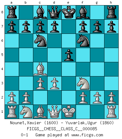 Last move : 0-1 2008 August 11 17:38:49 [Event "FICGS__CHESS__CLASS_C__000085"] [Site "FICGS"] [Date "2008.06.26"] [Round "1"] [White "Nounet,Xavier"] [Black "Yuvarlak,Ugur"] [Result "0-1"] [WhiteElo "1600"] [BlackElo "1860"] 1.e4 e5 2.Nf3 Nc6 3.Bc4 Nf6 4.c3 Nxe4 5.d3 Nf6 0-1 This chess game has been lost on time (started : 2008.06.26 21:39:10) Two knights defense Player Black won this chess game. Follow this game move after move (download)The chessboard is the world, the pieces are the phenomena of the Universe, the rules of the game are what we call the laws of Nature and the player on the other side is hidden from us. (Thomas Huxley) Wenn Dein Gegner dir ein Remis anbietet, versuch herauszufinden, weshalb er glaubt schlechter zu stehen. (Nigel Short) Coloca el contenido del tablero de Ajedrez en un sombrero, agita las piezas vigorosamente, derrámalas en el tablero desde una altura de medio metro y así obtienes el estilo de Wilhelm Steinitz. (H. E. Bird) On a dit que l'homme se distingue de l'animal par le fait qu'il achète plus de livres qu'il ne peut en lire. Je voudrais suggérer qu'inclure à la liste des livres quelques livres d'échecs rendrait la distinction manifeste. (Edward Lasker) Just because you do not take an interest in politics doesn't mean politics won't take an interest in you. (Pericles 430 B.C.)