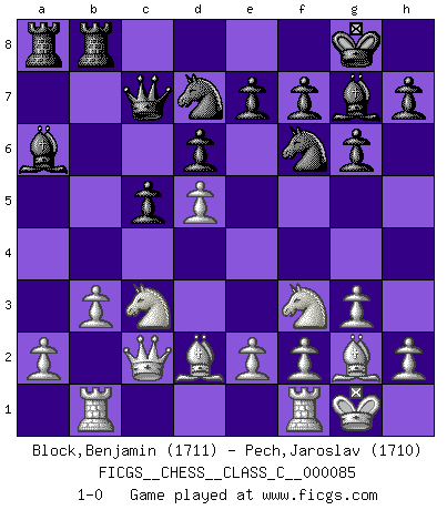Last move : 1-0 2008 October 16 23:39:26 [Event "FICGS__CHESS__CLASS_C__000085"] [Site "FICGS"] [Date "2008.06.26"] [Round "1"] [White "Block,Benjamin"] [Black "Pech,Jaroslav"] [Result "1-0"] [WhiteElo "1711"] [BlackElo "1710"] 1.d4 Nf6 2.c4 c5 3.d5 b5 4.cxb5 a6 5.bxa6 Bxa6 6.g3 d6 7.Bg2 g6 8.Nc3 Bg7 9.Nf3 Nbd7 10.Rb1 O-O 11.O-O Qa5 12.Bd2 Rfb8 13.b3 Qc7 14.Qc2 1-0 This chess game has been lost on time (started : 2008.06.26 21:39:10) Benko gambit accepted Kingside Castling by player Black (move 10) Kingside Castling by player White (move 11) Player White won this chess game. Follow this game move after move (download)I am the best player in the world and I am here to prove it. (Bobby Fischer) Besser ein falscher Plan, logisch durchgeführt, als gar kein Plan. (Viktor Kortschnoi) Un juego de Ajedrez es un dialogo, una conversación entre un jugador y su oponente. Cada movimiento del oponente puede contener amenazas o tropiezos, pero un jugador no se puede defender de las amenazas o tomar ventaja de los tropiezos si es que no se pregunta a sí mismo: ¿Que es lo que mi oponente va a hacer después de cada movida?. (Bruce A. Moon) Les réformistes prétendent que les progrès de la théorie conduiront à la disparition des échecs, et qu'il faut, pour leur rendre vie, en remanier les règles. En réalité, qu'exprime cette affirmation? Le mépris de l'intuition, de l'imagination et de tous les autres éléments qui font des échecs un art. (Alexander Alekhine) Patience, use the Force, think ! (Obi-Wan Kenobi in Star Wars ep.2)