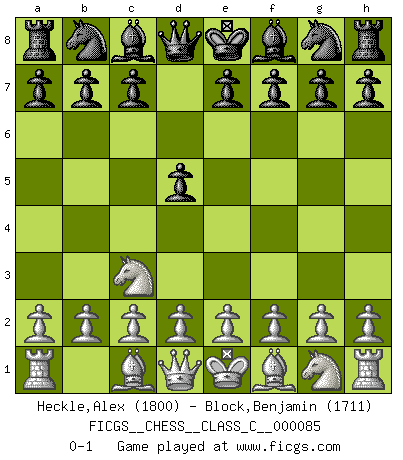 Last move : 0-1 2008 August 15 6:6:34 [Event "FICGS__CHESS__CLASS_C__000085"] [Site "FICGS"] [Date "2008.06.26"] [Round "1"] [White "Heckle,Alex"] [Black "Block,Benjamin"] [Result "0-1"] [WhiteElo "1800"] [BlackElo "1711"] 1.Nc3 d5 0-1 This chess game has been lost on time (started : 2008.06.26 21:39:10) Dunst (Sleipner, Heinrichsen) Opening Player Black won this chess game. Follow this game move after move (download)I don't believe in psychology. I believe in good moves. (Bobby Fischer) Es liegt in der Natur, vernüftig zu denken und unlogisch zu handeln. (Anatole France) El Ajedrez es parte de una cultura y si una cultura esta en decadencia, entonces también el Ajedrez declinará. (Mikhail Botvinnik) La tactique est l'élément le plus important du milieu de jeu. (Siegbert Tarrasch) What doesn't kill us makes us stronger. (Friedrich Nietzsche)