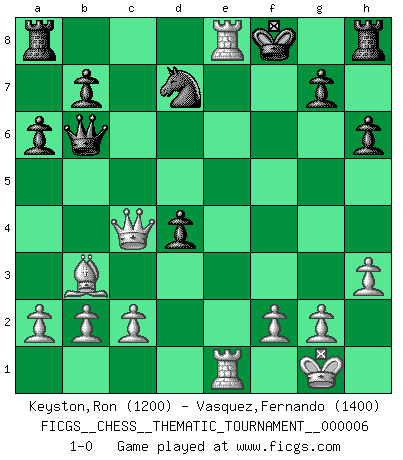 Last move : 1-0 2006 October 7 18:10:41 [Event "FICGS__CHESS__THEMATIC_TOURNAMENT__000006"] [Site "FICGS"] [Date "2006.07.23"] [Round "1"] [White "Keyston,Ron"] [Black "Vasquez,Fernando"] [Result "1-0"] [WhiteElo "1200"] [BlackElo "1400"] 1.e4 e5 2.Nf3 Nc6 3.d4 exd4 4.Bc4 Nf6 5.e5 Ng4 6.O-O d6 7.exd6 Qxd6 8.Na3 a6 9.h3 Nf6 10.Ng5 Nd8 11.Bb3 Be7 12.Nc4 Qc5 13.Re1 h6 14.Nf3 Ne6 15.Nce5 Qb6 16.Nxd4 Nxd4 17.Bxf7+ Kf8 18.Be3 c5 19.Bxd4 cxd4 20.Qd3 Bd6 21.Bb3 Bxe5 22.Rxe5 Bd7 23.Qc4 Be8 24.Rae1 Nd7 25.Rxe8+ 1-0 Scotch gambit : Dubois-Reti defense Kingside Castling by player White (move 6) Player White won this chess game. Follow this game move after move (download)Castle early and often. (Rob Sillars) Frage: Wie viele Autos haben Sie schon zerstört? - Antwort: Nur zwei. (Loek van Wely) Un entendimiento a fondo de las continuaciones típicas del mate, hace de las combinaciones de sacrificio mas complicadas conducirlas a ellas no solo sin dificultad, sino casi de una manera natural. (Siegbert Tarrasch) Les Echecs sont et restent toujours un combat, un combat intégral comme la boxe, la lutte ou un autre sport, et où il doit y avoir un vainqueur et un vaincu. (Joseph Emil Diemer) If only people were all showed a certain minimum level of niceness; if only people didn't retract verbal draw offers (without draw box ticked) on ficgs; if only people didn't kill; if only people didn't run concentration / extermination camps, if only people didn't drop nuclear bombs on Hiroshima and Nagasaki, and so on - it would be a much more beautiful world. But sadly, things are not so... (Normajean Yates)