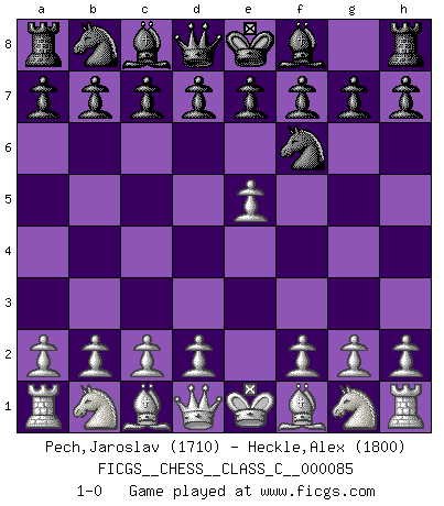 Last move : 1-0 2008 August 7 5:14:40 [Event "FICGS__CHESS__CLASS_C__000085"] [Site "FICGS"] [Date "2008.06.26"] [Round "1"] [White "Pech,Jaroslav"] [Black "Heckle,Alex"] [Result "1-0"] [WhiteElo "1710"] [BlackElo "1800"] 1.e4 Nf6 2.e5 1-0 This chess game has been lost on time (started : 2008.06.26 21:39:10) Alekhine's defense Player White won this chess game. Follow this game move after move (download)When you play Bobby, it is not a question if you win or lose. It is a question if you survive. (Boris Spassky) Später, ... hatte ich zunehmend Erfolg in entscheidenden Partien. Vielleicht weil ich eine einfache Wahrheit erkannte: nicht nur ich hatte Angst, auch mein Gegner. (Mikhail Nekhemyevich Tal) Todos los jugadores de Ajedrez deberían tener un pasatiempo. (Savielly Tartakower) Mais l'homme est une créature légère et illogique : semblable au joueur d'échecs, il n'aime que le processus du but à atteindre, non le but lui-même. (Dostoïevsky) No enterprise is more likely to succeed than one concealed from the enemy until it is ripe for execution. (Niccolo Machiavelli)