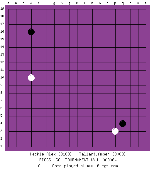 Last move : 0-1 2008 July 30 4:45:52 [Event "FICGS__GO__TOURNAMENT_KYU__000064"] [Site "FICGS"] [Date "2008.06.27"] [Round "1"] [Black "Heckle,Alex"] [White "Tallant,Amber"] [Result "0-1"] [Rating 1 "0100"] [Rating 2 "0000"] 1.d16 d10 2.q4 p3 0-1 This go game has been lost on time (started : 2008.06.27 18:38:9) Here are the names of the openings (joseki) played in the four corners : Corner q4 : q4 p3 Hoshi (Hwajeom, Seongjeom, Xingwei`) 4-4 Point. The star or hoshi (4-4) point, emphasizing influence at the potential expense of territory. Player White won this Go (weiqi, baduk) game. Follow this game move after move (download)The rectangular six is normally alive. (Anonymous) I couldn't make any sense out of what this particular thread is about. It sounds like R2 D2 computer speaking. A space fight ?!? Some 'command' problems in Moscow ? Some killers & narcotic addicts attacking some game & a god wannabe ?? (Dinesh De Silva, lost in a russian conflict in FICGS forum)