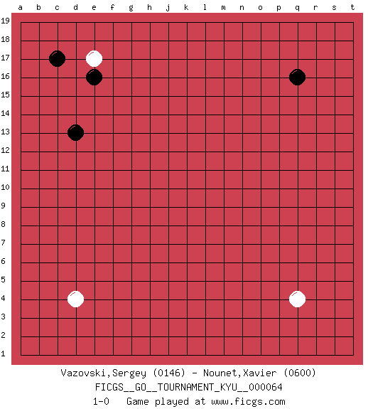 Last move : 1-0 2008 August 9 17:25:54 [Event "FICGS__GO__TOURNAMENT_KYU__000064"] [Site "FICGS"] [Date "2008.06.27"] [Round "1"] [Black "Vazovski,Sergey"] [White "Nounet,Xavier"] [Result "1-0"] [Rating 1 "0146"] [Rating 2 "0600"] 1.q16 d4 2.c17 q4 3.d13 e17 4.e16 1-0 This go game has been lost on time (started : 2008.06.27 18:38:9) Here are the names of the openings (joseki) played in the four corners : Player Black won this Go (weiqi, baduk) game. Follow this game move after move (download)The L-group is dead. (Anonymous) Logic : The art of thinking and reasoning in strict accordance with the limitations and incapacities of the human misunderstanding. (Ambrose Bierce)