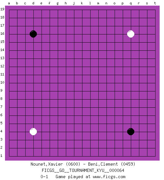 Last move : 0-1 2008 August 16 18:9:13 [Event "FICGS__GO__TOURNAMENT_KYU__000064"] [Site "FICGS"] [Date "2008.06.27"] [Round "1"] [Black "Nounet,Xavier"] [White "Beni,Clement"] [Result "0-1"] [Rating 1 "0600"] [Rating 2 "0459"] 1.d16 d4 2.q4 q16 0-1 This go game has been lost on time (started : 2008.06.27 18:38:9) Here are the names of the openings (joseki) played in the four corners : Player White won this Go (weiqi, baduk) game. Follow this game move after move (download)Very few good moves are played. (Pierre Audouard) Begin at the beginning and go on till you come to the end; then stop. (Lewis Carrol, Alice in Wonderland)