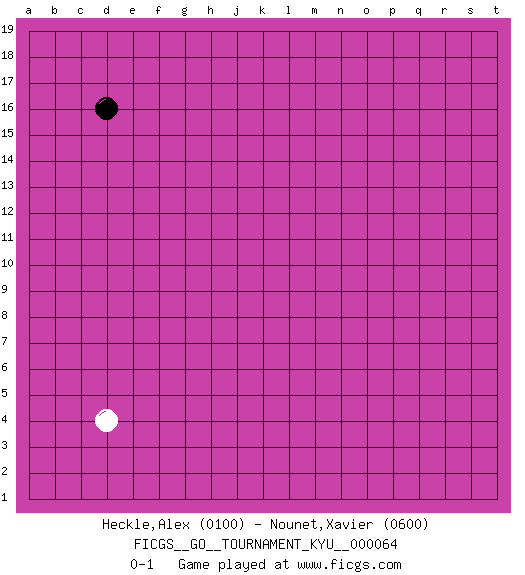 Last move : 0-1 2008 August 8 5:18:8 [Event "FICGS__GO__TOURNAMENT_KYU__000064"] [Site "FICGS"] [Date "2008.06.27"] [Round "1"] [Black "Heckle,Alex"] [White "Nounet,Xavier"] [Result "0-1"] [Rating 1 "0100"] [Rating 2 "0600"] 1.d16 d4 0-1 This go game has been lost on time (started : 2008.06.27 18:38:9) Here are the names of the openings (joseki) played in the four corners : Corner d4 : d4 0-1 Hoshi (Hwajeom, Seongjeom, Xingwei`) 4-4 Point. The star or hoshi (4-4) point, emphasizing influence at the potential expense of territory. Player White won this Go (weiqi, baduk) game. Follow this game move after move (download)Studying go is a wonderful way to develop both the creative as well as the logical abilities of children because to play it both sides of the brain are necessary. (Cho Chikun) The difference between stupidity and genius is that genius has its limits. (Murphy)