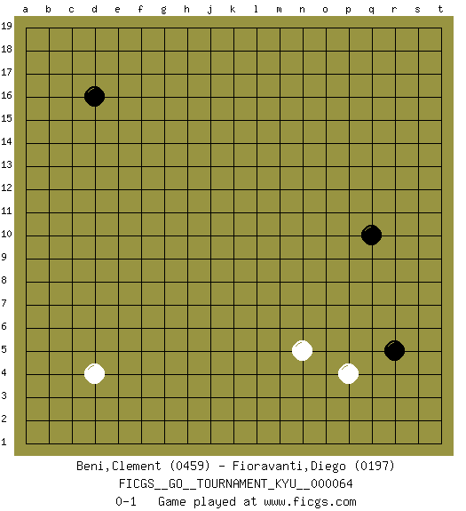 Last move : 0-1 2008 August 29 19:37:21 [Event "FICGS__GO__TOURNAMENT_KYU__000064"] [Site "FICGS"] [Date "2008.06.27"] [Round "1"] [Black "Beni,Clement"] [White "Fioravanti,Diego"] [Result "0-1"] [Rating 1 "0459"] [Rating 2 "0197"] 1.q10 d4 2.d16 p4 3.r5 n5 0-1 This go game has been lost on time (started : 2008.06.27 18:38:9) Here are the names of the openings (joseki) played in the four corners : Corner q4 : p4 r5 Takamoku (Gomok, Gaomu`) 5-4 Point. The takamoku (high) point (5-4). With its emphasis on influence, the 5-4 point complements the 4-4 (hoshi) point in creating an influence-oriented fuseki. Player White won this Go (weiqi, baduk) game. Follow this game move after move (download)Always remember, keep the balance. [between territory and influence] (Figaro) The only sure thing about luck is that it will change. (Wilson Mizner)