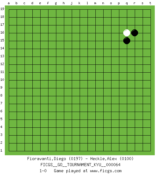 Last move : 1-0 2008 August 4 4:59:35 [Event "FICGS__GO__TOURNAMENT_KYU__000064"] [Site "FICGS"] [Date "2008.06.27"] [Round "1"] [Black "Fioravanti,Diego"] [White "Heckle,Alex"] [Result "1-0"] [Rating 1 "0197"] [Rating 2 "0100"] 1.r16 q16 2.q15 1-0 This go game has been lost on time (started : 2008.06.27 18:38:9) Here are the names of the openings (joseki) played in the four corners : Corner q16 : r16 q16 Komoku (Somok, Xiao~mu`) 3-4 Point. The komoku (3-4) point is the traditional corner enclosure move.. Player Black won this Go (weiqi, baduk) game. Follow this game move after move (download)If a formation is symmetrical, play at the center. (Anonymous) Experience is the name we all give to our mistakes. (Oscar Wilde)