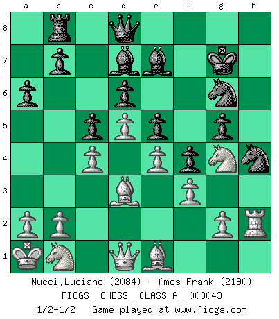 Last move : 1/2-1/2 2008 November 23 4:8:5 [Event "FICGS__CHESS__CLASS_A__000043"] [Site "FICGS"] [Date "2008.06.28"] [Round "1"] [White "Nucci,Luciano"] [Black "Amos,Frank"] [Result "1/2-1/2"] [WhiteElo "2084"] [BlackElo "2190"] 1.d4 d6 2.c4 g6 3.Nc3 Bg7 4.e4 e5 5.d5 Ne7 6.Be3 f5 7.f3 c5 8.Bd3 f4 9.Bf2 g5 10.h4 h6 11.Qa4+ Kf7 12.hxg5 hxg5 13.Rxh8 Bxh8 14.O-O-O Nd7 15.Nh3 Bf6 16.Rh1 Ng6 17.Qc2 Ndf8 18.Be1 Nh4 19.Kb1 Nfg6 20.Rh2 a6 21.Nf2 Kg7 22.Ka1 Bd7 23.Ng4 Be7 24.Qd1 Rb8 25.Nb1 1/2-1/2 Modern defense : Averbakh system Queenside Castling by player White (move 14) This chess game ended in a draw. Follow this game move after move (download)Every Chess master was once a beginner. (Chernev) Vielleicht wirkt die Aura früherer Spieler glanzvoller als die der heutigen Spieler, aber das liegt daran, dass man kein Programm wie Fritz hatte, das einem all die Löcher in ihren Partien zeigt. (Vladimir Kramnik) Jugadores de primera clase pierden en contra de jugadores de segunda clase porque los jugadores de segunda clase a veces juegan una partida de primer clase. (Siegbert Tarrasch) Mais n'est-ce pas déjà le limiter injurieusement que d'appeler les échecs un jeu? N'est-ce pas aussi une science, un art, ou quelque chose qui, comme le cercueil de Mahomet entre ciel et terre, est suspendu entre l'un et l'autre, et qui réunit un nombre incroyable de contraires ? (Stefan Zweig) The problem with troubleshooting is that trouble shoots back. (Anonymous)