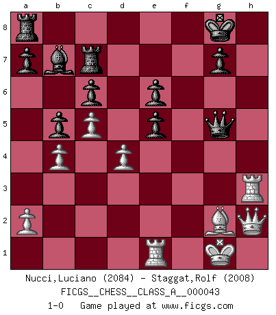 Last move : 1-0 2009 January 2 2:30:10 [Event "FICGS__CHESS__CLASS_A__000043"] [Site "FICGS"] [Date "2008.06.28"] [Round "1"] [White "Nucci,Luciano"] [Black "Staggat,Rolf"] [Result "1-0"] [WhiteElo "2084"] [BlackElo "2008"] 1.d4 Nf6 2.c4 e6 3.Nf3 b6 4.g3 Ba6 5.b3 Bb4+ 6.Bd2 Be7 7.Bg5 c6 8.Bg2 d5 9.Nbd2 Nbd7 10.O-O O-O 11.Qc2 Rc8 12.e4 dxe4 13.Nxe4 Nxe4 14.Bxe7 Qxe7 15.Qxe4 Nf6 16.Qf4 Bb7 17.Rfe1 Rfd8 18.Rad1 Qa3 19.g4 h6 20.Ne5 Qe7 21.h4 Nh7 22.c5 Rc7 23.b4 b5 24.Rd3 Ra8 25.g5 hxg5 26.hxg5 Nxg5 27.Qh2 f6 28.f4 fxe5 29.fxg5 Qxg5 30.Rh3 1-0 Queen's Indian : Nimzovich variation (exaggerated Fianchetto) Kingside Castling by player White (move 10) Kingside Castling by player Black (move 10) Player White won this chess game. Follow this game move after move (download)The stomach is an essential part of the Chess master. (Bent Larsen) Drei Punkte vor allen anderen ist wie einer, der im weißen Anzug posiert, während der Rest in Müllsäcke gekleidet dasteht. (Viktor Kortschnoi) Ayuda a tus piezas para que ellas te puedan ayudar. (Paul Morphy) Le plus grand jeu de l'esprit jamais inventé, plus vous l'apprenez, plus vous y prenez du plaisir. (Garry Kasparov) Wisdom doesn't necessarily come with age. Sometimes age just shows up all by itself. (Tom Watson)