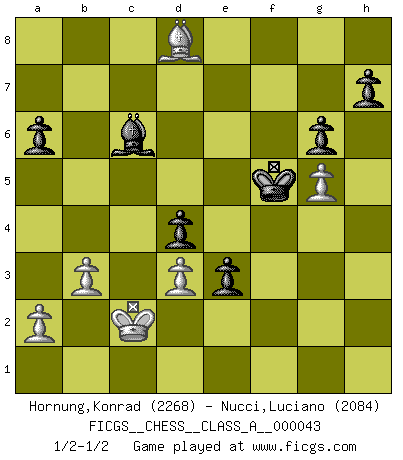 Last move : 1/2-1/2 2009 February 28 22:45:17 [Event "FICGS__CHESS__CLASS_A__000043"] [Site "FICGS"] [Date "2008.06.28"] [Round "1"] [White "Hornung,Konrad"] [Black "Nucci,Luciano"] [Result "1/2-1/2"] [WhiteElo "2268"] [BlackElo "2084"] 1.e4 c5 2.Nf3 d6 3.d4 cxd4 4.Nxd4 Nf6 5.Nc3 g6 6.Be3 Bg7 7.f3 O-O 8.Qd2 Nc6 9.Bc4 Bd7 10.O-O-O Rc8 11.Bb3 Ne5 12.Kb1 Nc4 13.Bxc4 Rxc4 14.g4 b5 15.b3 Rc8 16.Ndxb5 a6 17.Nd4 Re8 18.h4 Qa5 19.Nd5 Qxd2 20.Nxf6+ Bxf6 21.Rxd2 Rc3 22.Rd3 Rec8 23.Rh2 Rxd3 24.cxd3 Rc3 25.Rd2 Bxh4 26.g5 f5 27.Kb2 Rc7 28.f4 Be1 29.Rc2 Rxc2+ 30.Kxc2 e5 31.fxe5 dxe5 32.Nf3 Bg3 33.Bc5 Kf7 34.Bd6 Ke6 35.Bb8 Bc6 36.Nd4+ exd4 37.Bxg3 fxe4 38.Bc7 Kf5 39.Bd8 e3 1/2-1/2 Sicilian : Dragon, Yugoslav attack, 7...O-O Kingside Castling by player Black (move 7) Queenside Castling by player White (move 10) This chess game ended in a draw. Follow this game move after move (download)Nothing excites jaded Grandmasters more than a theoretical novelty. (Dominic Lawson) Versuche, dich von der Sklaverei der Eröffnungsvarianten zu befreien. Stattdessen soll man gewisse Typenpositionen erlernen, die man eingehend analysiert. (Aaron Nimzowitsch) Sin errores no puede haber brillantez. (Emanuel Lasker) La vie et les Echecs sont tous les deux une lutte constante. (Lasker) There will be no order, only chaos. (Sol Robeson in Pi by Darren Aronofsky)