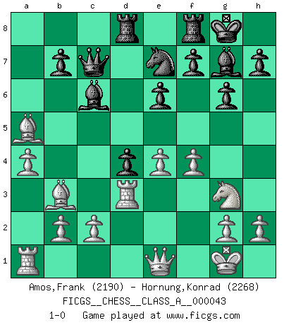 Last move : 1-0 2008 November 17 19:32:14 [Event "FICGS__CHESS__CLASS_A__000043"] [Site "FICGS"] [Date "2008.06.28"] [Round "1"] [White "Amos,Frank"] [Black "Hornung,Konrad"] [Result "1-0"] [WhiteElo "2190"] [BlackElo "2268"] 1.e4 c5 2.Nc3 Nc6 3.f4 g6 4.Nf3 Bg7 5.Bc4 e6 6.O-O Nge7 7.Qe1 O-O 8.d3 Nd4 9.Nxd4 cxd4 10.Ne2 d5 11.Bb3 dxe4 12.dxe4 Bd7 13.Rf3 Bc6 14.Ng3 Qd7 15.a4 Rad8 16.Rd3 Qc7 17.Bd2 a5 18.Bxa5 1-0 Sicilian : Grand Prix attack Kingside Castling by player White (move 6) Kingside Castling by player Black (move 7) Player White won this chess game. Follow this game move after move (download)Fischer is the strongest player in the world. In fact, the strongest player who ever lived. (Larry Evans) Gegen einen Schachcomputer zu verlieren ist wie Löcher in den Strümpfen zuhaben. Es ist nicht peinlich, solange man der einzige ist der es weiß. (Anonymous) Bobby solo arroja las piezas y solas caen en las casillas correctas. (Miguel Najdorf ) Vouloir jouer aux échecs contre soi-même est aussi paradoxal que vouloir marcher sur son ombre. (Stefan Zweig) Coffee just isn't my cup of tea. (Unknown)