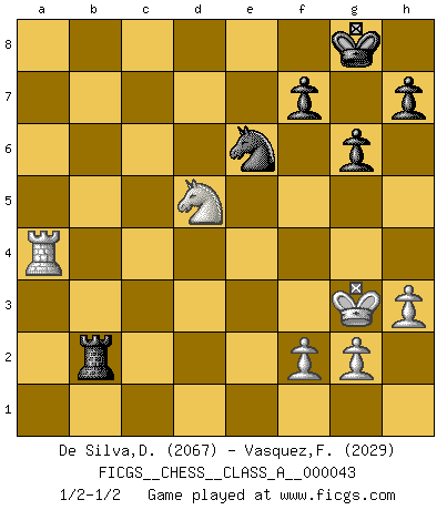 Last move : 1/2-1/2 2009 January 18 6:11:1 [Event "FICGS__CHESS__CLASS_A__000043"] [Site "FICGS"] [Date "2008.06.28"] [Round "1"] [White "De Silva,Dinesh"] [Black "Vasquez,Fernando"] [Result "1/2-1/2"] [WhiteElo "2067"] [BlackElo "2029"] 1.e4 e5 2.Nf3 Nf6 3.Nxe5 d6 4.Nf3 Nxe4 5.d4 d5 6.Bd3 Nc6 7.O-O Be7 8.c4 Nb4 9.Be2 O-O 10.Nc3 Bf5 11.a3 Nxc3 12.bxc3 Nc6 13.Re1 Re8 14.cxd5 Qxd5 15.Bf4 Rac8 16.Bd3 b5 17.Qb1 Bxd3 18.Qxd3 Bd6 19.Bxd6 cxd6 20.a4 bxa4 21.Qa6 g6 22.Qxa4 Rxe1+ 23.Nxe1 Rb8 24.Nc2 Qb3 25.h3 d5 26.Ne3 Qxc3 27.Nxd5 Qxd4 28.Qxd4 Nxd4 29.Rxa7 Rb1+ 30.Kh2 Rb2 31.Ra4 Ne6 32.Kg3 1/2-1/2 Petrov : Classical attack Kingside Castling by player White (move 7) Kingside Castling by player Black (move 9) This chess game ended in a draw. Follow this game move after move (download)We cannot resist the fascination of sacrifice, since a passion for sacrifices is part of a Chessplayer's nature. (Rudolf Spielman) Wenn du auf das Glück wartest, wird das Leben ziemlich langweilig. (Mikhail Nekhemyevich Tal) De eso se trata el Ajedrez. Un día le das una lección a tu oponente y al día siguiente el te da una a tí. (Bobby Fischer) À la honte des hommes, on sait que les lois du jeu sont les seules qui soient partout justes, claires, inviolables et exécutées. Pourquoi l'Indien qui a donné les règles du jeu d'échecs est-il obéi de bon gré dans toute la terre, et que les décrétales des papes, par exemple, sont aujourd'hui un objet d'horreur et de mépris ? C'est que l'inventeur des échecs combina tout avec justesse pour la satisfaction des joueurs, et que les papes, dans leurs décrétales, n'eurent en vue que leur seul avantage. L'Indien voulut exercer également l'esprit des hommes et leur donner du plaisir; les papes ont voulu abrutir l'esprit des hommes. Voltaire (Dictionnaire philosophique / Garnier 1967) Without enthusiasm, virtue functions not at all, and vice only poorly. (Mignon McLaughlin, The Neurotic's Notebook, 1960)