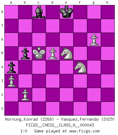 Last move : 1-0 2009 January 21 7:36:57 [Event "FICGS__CHESS__CLASS_A__000043"] [Site "FICGS"] [Date "2008.06.28"] [Round "1"] [White "Hornung,Konrad"] [Black "Vasquez,Fernando"] [Result "1-0"] [WhiteElo "2268"] [BlackElo "2029"] 1.e4 e5 2.Nf3 Nf6 3.Nxe5 d6 4.Nf3 Nxe4 5.Bd3 Nf6 6.h3 Be7 7.O-O O-O 8.c3 Re8 9.Bc2 d5 10.d4 Bd6 11.Bg5 h6 12.Bh4 g5 13.Bg3 Nc6 14.Bxd6 Qxd6 15.Nh2 Kg7 16.Nd2 Bd7 17.Qf3 Ne7 18.Rfe1 Ng4 19.Nxg4 Ng6 20.Bxg6 fxg6 21.Rxe8 Rxe8 22.Ne5 Bf5 23.g4 Be6 24.Qg3 Bd7 25.Ndf3 Be6 26.Re1 Re7 27.Nd3 Qxg3+ 28.fxg3 Kf6 29.Nc5 Bc8 30.Rxe7 Kxe7 31.Ne5 Kf6 32.Ncd3 Be6 33.Kf2 Bc8 34.Nb4 Be6 35.Nc2 Bc8 36.Ne3 Be6 37.h4 gxh4 38.gxh4 c5 39.Nd3 cxd4 40.cxd4 Kf7 41.Nb4 Bd7 42.Nbxd5 Bb5 43.g5 hxg5 44.hxg5 Kg7 45.Nf4 a5 46.Ng4 Bd7 47.Ne5 Bf5 48.d5 Kf8 49.Nfxg6+ Ke8 50.Ke3 a4 51.a3 b5 52.Kd4 Bc8 53.Kc5 Bh3 54.Nf4 Bc8 55.g6 1-0 Petrov's defense Kingside Castling by player White (move 7) Kingside Castling by player Black (move 7) Player White won this chess game. Follow this game move after move (download)I know people who have all the will in the world, but still can't play good Chess. (Bobby Fischer) Meine Liebe ist Schach, Schach, Schach. Ich muss jeden Tag Schach spielen, deshalb fühle ich mich so stark. (Miguel Najdorf) El Ajedrez es el juego mas altamente simbólico, pero las agresiones estan por lo tanto aún mas francamente representadas en la partida. Tal vez comenzo como un juego de guerra; Algo como la representación de una batalla en miniatura entre las fuerzas de dos reinos. (Karl Meninger) Vous savez, camarade Pachman, je n'éprouve pas de plaisir à être ministre, je jouerais plutôt aux échecs comme vous, ou alors ferais une révolution au Venezuela. (Che Guevara à Ludek Pachman, 'Checkmate in Prague', 1975) Art is the only way to run away without leaving home. (Twyla Tharp)