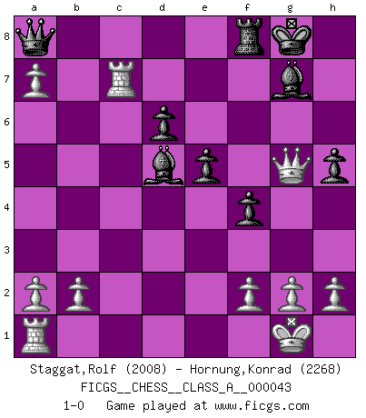 Last move : 1-0 2009 January 10 21:32:0 [Event "FICGS__CHESS__CLASS_A__000043"] [Site "FICGS"] [Date "2008.06.28"] [Round "1"] [White "Staggat,Rolf"] [Black "Hornung,Konrad"] [Result "1-0"] [WhiteElo "2008"] [BlackElo "2268"] 1.e4 c5 2.Nf3 Nc6 3.d4 cxd4 4.Nxd4 Nf6 5.Nc3 e5 6.Ndb5 d6 7.Bg5 a6 8.Na3 b5 9.Bxf6 gxf6 10.Nd5 f5 11.Bd3 Be6 12.O-O Bg7 13.Qh5 f4 14.c4 Nd4 15.cxb5 O-O 16.bxa6 f5 17.Nc3 fxe4 18.Bxe4 h6 19.Bxa8 Qxa8 20.Ncb5 Nxb5 21.Nxb5 Bc4 22.Rfc1 Bxb5 23.Rc7 Be8 24.Qg4 Bf7 25.a7 h5 26.Qf5 Bd5 27.Qg5 1-0 Sicilian : Pelikan (Lasker/Sveshnikov) variation Kingside Castling by player White (move 12) Kingside Castling by player Black (move 15) Player White won this chess game. Follow this game move after move (download)I guess a certain amount of temperament is expected of Chess geniuses. (Ron Gross) Das Schachspiel übertrifft alle anderen Spiele so weit wie der Chimborasso einen Misthaufen. (Arthur Schopenhauer) No es suficiente ser un buen jugador, se debe también de jugar bién. (Siegbert Tarrasch) Je menace de comprendre la position. (Anonyme) Only sick music makes money today. (Friedrich Nietzsche)