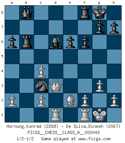 Last move : 1/2-1/2 2009 January 18 9:29:17 [Event "FICGS__CHESS__CLASS_A__000043"] [Site "FICGS"] [Date "2008.06.28"] [Round "1"] [White "Hornung,Konrad"] [Black "De Silva,Dinesh"] [Result "1/2-1/2"] [WhiteElo "2268"] [BlackElo "2067"] 1.e4 c5 2.Nf3 Nc6 3.d4 cxd4 4.Nxd4 e6 5.Nc3 a6 6.Be2 Qc7 7.O-O Nf6 8.Be3 Bb4 9.Na4 Be7 10.Nxc6 bxc6 11.Nb6 Rb8 12.Nxc8 Qxc8 13.Bd4 c5 14.Be5 Rb6 15.Qd3 d6 16.Bc3 O-O 17.Rad1 d5 18.exd5 Nxd5 19.Be5 f6 20.Bc3 Bd6 21.b3 Qb8 22.g3 c4 23.bxc4 Nxc3 1/2-1/2 Sicilian defense Kingside Castling by player White (move 7) Kingside Castling by player Black (move 16) This chess game ended in a draw. Follow this game move after move (download)The chessboard is the world, the pieces are the phenomena of the Universe, the rules of the game are what we call the laws of Nature and the player on the other side is hidden from us. (Thomas Huxley) Kasparov stellt für gewöhnlich die Regeln auf und bricht sie dann selbst wieder. (Alexej Shirov) Hay jugadores fuertes y personas amables y yo soy un jugador fuerte. (Bobby Fischer) Vous n'êtes pas toujours obligé de jouer le meilleur coup. Un coup doit être actif, entreprenant, correct et beau ! (David Bronstein) A mistake is only a mistake if you let it happen twice. Otherwise it is a learning experience. (Daniel Parmet)