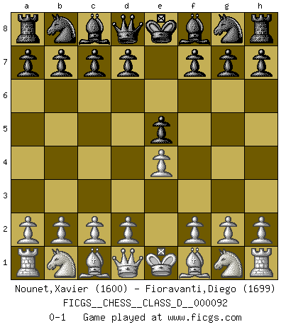 Last move : 0-1 2008 September 22 10:18:32 [Event "FICGS__CHESS__CLASS_D__000092"] [Site "FICGS"] [Date "2008.06.29"] [Round "1"] [White "Nounet,Xavier"] [Black "Fioravanti,Diego"] [Result "0-1"] [WhiteElo "1600"] [BlackElo "1699"] 1.e4 e5 0-1 This chess game has been lost on time (started : 2008.06.29 16:54:54) King's pawn game Player Black won this chess game. Follow this game move after move (download)Chess problems demand from the composer the same virtues that characterize all worthwhile art: originality, invention, conciseness, harmony, complexity, and splendid insincerity. (Vladimir Nabokov) Im Internet Chess Club betrug mein Rating vorübergehend 3350 ELO-Punkte. (Sergej Karjakin) De eso se trata el Ajedrez. Un día le das una lección a tu oponente y al día siguiente el te da una a tí. (Bobby Fischer) Lorsque vous vous retrouvez devant une position atroce, ne tendez pas un ultime piège dérisoire avec l'intention d'abandonner si l'adversaire le déjoue ! Faites-vous plutôt un devoir de résister comme si votre vie en dépendait. Jouez le coup qui vous déplairait au centuple si vous étiez dans la peau de votre tortionnaire ! I've never seen so many men wasted so badly. (Blondie in The Good, The Bad and The Ugly)