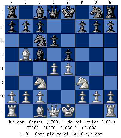 Last move : 1-0 2008 August 12 17:48:9 [Event "FICGS__CHESS__CLASS_D__000092"] [Site "FICGS"] [Date "2008.06.29"] [Round "1"] [White "Munteanu,Sergiu"] [Black "Nounet,Xavier"] [Result "1-0"] [WhiteElo "1800"] [BlackElo "1600"] 1.e4 e5 2.Nf3 Nc6 3.Bb5 Bc5 4.Nc3 d6 5.d4 1-0 This chess game has been lost on time (started : 2008.06.29 16:54:54) Ruy Lopez : Classical (Cordel) defense Player White won this chess game. Follow this game move after move (download)Chess is not like life... it has rules ! (Mark Pasternak) Ohne ihre Erfolge schmälern zu wollen würde ich sagen Petrosian, Spassky und Karpov verdanken ihre Siege ihren Trainern - Boleslavsky, Bondarevsky und Furman. (Mikhail Moiseyevich Botvinik) Peones: ellos son el alma de esta partida, solos forman el ataque y la defensa. (Philidor) Le système Elo représente seulement une moyenne. Il est simplement un indicateur de votre stabilité. (Anatoli Karpov) The quality of decision is like the well-timed swoop of a falcon which enables it to strike and destroy its victim. (Sun Tzu)
