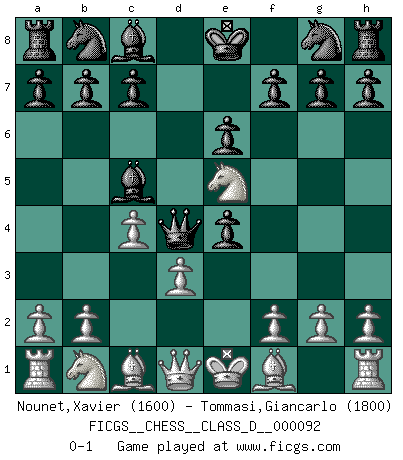 Last move : 0-1 2008 August 13 5:57:38 [Event "FICGS__CHESS__CLASS_D__000092"] [Site "FICGS"] [Date "2008.06.29"] [Round "1"] [White "Nounet,Xavier"] [Black "Tommasi,Giancarlo"] [Result "0-1"] [WhiteElo "1600"] [BlackElo "1800"] 1.e4 e6 2.Nf3 d5 3.c4 dxe4 4.Ne5 Bc5 5.d3 Qd4 0-1 This chess game has been lost on time (started : 2008.06.29 16:54:54) French defense Player Black won this chess game. Follow this game move after move (download)Fischer, who may or may not be mad as a hatter, has every right to be horrified. (Jeremy Silman) Ich war schon mal beim Dopingtest. Da musste ich Urin abgeben, während Dritte zusahen. (Elisabeth Pähtz) Creo que una cierta cantidad de temperamento es esperada de los genios del Ajedrez. (Ron Gross) Les échecs, c'est l'imagination. (David Bronstein) Home computers are being called upon to perform many new functions, including the consumption of homework formerly eaten by the dog. (Doug Larson)