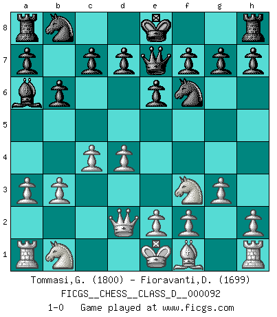 Last move : 1-0 2008 September 12 16:5:59 [Event "FICGS__CHESS__CLASS_D__000092"] [Site "FICGS"] [Date "2008.06.29"] [Round "1"] [White "Tommasi,Giancarlo"] [Black "Fioravanti,Diego"] [Result "1-0"] [WhiteElo "1800"] [BlackElo "1699"] 1.d4 e6 2.c4 Nf6 3.Nf3 b6 4.g3 Ba6 5.b3 Bb4+ 6.Bd2 Qe7 7.a3 Bxd2+ 8.Qxd2 1-0 Queen's pawn Player White won this chess game. Follow this game move after move (download)It's always better to sacrifice your opponent's men. (Savielly Tartakover) Schach ist das schnellste Spiel der Welt, weil man in jeder Sekunde Tausende von Gedanken ordnen muß. (Albert Einstein) Tu puedes aprender mucho mas de una partida que pierdas que de una partida ganada. Tendras que perder cientos de partidas antes de llegar a ser un buen jugador. (Jose Raul Capablanca) Des combinaisons [dans le jeu d'échecs] pareilles à des mélodies. Je crois entendre pour ainsi dire la musique des coups... (Vladimir Nabokov) Lottery : A tax on people who are bad at math. (Author unknown)