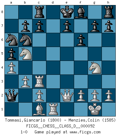 Last move : 1-0 2008 July 13 22:49:12 [Event "FICGS__CHESS__CLASS_D__000092"] [Site "FICGS"] [Date "2008.06.29"] [Round "1"] [White "Tommasi,Giancarlo"] [Black "Menzies,Colin"] [Result "1-0"] [WhiteElo "1800"] [BlackElo "1585"] 1.e4 Nf6 2.e5 Nd5 3.d4 d6 4.Nf3 Nb6 5.a4 a5 6.Nc3 Bg4 7.Be2 dxe5 8.Nxe5 Bxe2 9.Qxe2 Qxd4 10.Nb5 Qc5 11.Ra3 Na6 12.Rc3 Qd5 13.O-O f6 14.Ng4 Rc8 15.Rd1 Qa2 16.b3 1-0 Alekhine's defense : Modern, Schmid variation Kingside Castling by player White (move 13) Player White won this chess game. Follow this game move after move (download)All Chess players should have a hobby. (Savielly Tartakower) Wie bekannt hörte Morphy 1859 auf, Schach zu spielen. Seine Enttäuschung galt nicht so sehr dem Schach, wie den Schachspielern. (Robert James Fischer) Debemos de asegurarnos de que el Ajedrez no se convierta en un lenguaje muerto, muy interesante, pero tan solo para un grupo muy pequeño. (Sytze Faber) On peut tirer plus d'utilité d'une partie perdue que de 100 parties gagnées. (Capablanca) I don't diet. I just don't eat as much as I'd like to. (Linda Evangelista, supermodel)