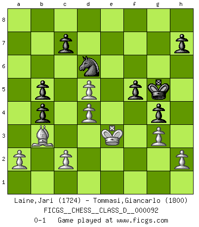 Last move : 0-1 2009 April 6 12:31:27 [Event "FICGS__CHESS__CLASS_D__000092"] [Site "FICGS"] [Date "2008.06.29"] [Round "1"] [White "Laine,Jari"] [Black "Tommasi,Giancarlo"] [Result "0-1"] [WhiteElo "1724"] [BlackElo "1800"] 1.e4 d6 2.d4 Nf6 3.Nc3 g6 4.f4 Bg7 5.Nf3 O-O 6.Bd3 Nc6 7.e5 dxe5 8.fxe5 Nd7 9.O-O Nb6 10.Be3 f6 11.exf6 exf6 12.d5 Nb4 13.Bxb6 axb6 14.Bc4 Kh8 15.Qd2 Bg4 16.Rae1 Bxf3 17.Rxf3 Nc6 18.Qf4 g5 19.Qe4 Ne5 20.Rf5 Re8 21.Ref1 Nf7 22.Qd3 Qd6 23.Kh1 Qc5 24.Bb3 Nd6 25.R5f3 g4 26.Rf4 f5 27.g3 Re3 28.Qd2 Bxc3 29.bxc3 b5 30.Re1 Rxe1+ 31.Qxe1 Re8 32.Qd2 Re3 33.Qd4+ Qxd4 34.cxd4 Kg7 35.Kg2 Kf6 36.Kf2 Re7 37.Kg1 Re2 38.Rf2 Re1+ 39.Rf1 Rxf1+ 40.Kxf1 b4 41.Ke2 Kg5 42.Ke3 b5 0-1 Pirc : Austrian attack, 6.Bd3 Kingside Castling by player Black (move 5) Kingside Castling by player White (move 9) Player Black won this chess game. Follow this game move after move (download)I like to say that Bobby Fischer was the greatest player ever. But what made Fischer a genius was his ability to blend an American freshness and pragmatism with Russian ideas about strategy. (Bruce Pandolfini) Jeder leidlich begabte Spieler, er braucht keineswegs hervorragend veranlagt zu sein, kann es zum Meister bringen. Aber das ist ja auch gar nicht nötig! Der richtige Standpunkt ist es, zu seinem Vergnügen zu spielen, und man glaube ja nicht, dass der Genuss proportional dem Können sei. (Siegbert Tarrasch) Yo nunca en mi vida he jugado la Defensa Francesa, que viene siendo la más aburrida de todas las Aperturas. (Wilhelm Steinitz) Que feriez-vous si vous étiez en train de jouer aux échecs et que la fin du monde arrive ? Je continuerais à jouer. (Saint Borromée) Think like a man of action, act like a man of thought. (Henri Louis Bergson)