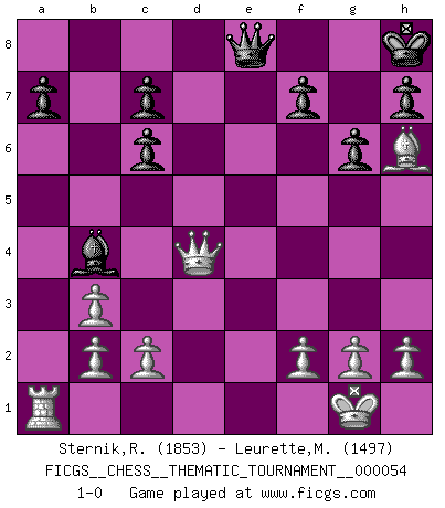 Last move : 1-0 2008 July 3 15:3:4 [Event "FICGS__CHESS__THEMATIC_TOURNAMENT__000054"] [Site "FICGS"] [Date "2008.06.30"] [Round "1"] [White "Sternik,Ryszard"] [Black "Leurette,Marc-Antoine"] [Result "1-0"] [WhiteElo "1853"] [BlackElo "1497"] 1.e4 Nf6 2.Nc3 e5 3.Bc4 Nxe4 4.Qh5 Nd6 5.Bb3 Be7 6.Nf3 Nc6 7.Nxe5 g6 8.Nxc6 dxc6 9.Qf3 O-O 10.O-O Qe8 11.Re1 Be6 12.d4 Bxb3 13.axb3 Qd7 14.d5 Nb5 15.dxc6 bxc6 16.Be3 Bb4 17.Bh6 Rfe8 18.Ne4 Nd4 19.Nf6+ Kh8 20.Rxe8+ Rxe8 21.Qd1 Qd8 22.Nxe8 Qxe8 23.Qxd4+ 1-0 Alekhine's defense Kingside Castling by player Black (move 9) Kingside Castling by player White (move 10) Player White won this chess game. Follow this game move after move (download)In Chess, just as in life, today's bliss may be tomorrow's poison. (Assaic) Der Bart als Geschlechtszeichen mitten im Gesicht ist obszön. Daher gefällt er den Weibern. [Zugegeben, kein Schachzitat, aber unglaublich originell] (Arthur Schopenhauer) Me dio la sensación de como si yo estuviera jugando en contra del mismo Ajedrez. - al estar jugando en contra de Robert Fischer (Walter Shipman) Lorsque vous vous retrouvez devant une position atroce, ne tendez pas un ultime piège dérisoire avec l'intention d'abandonner si l'adversaire le déjoue ! Faites-vous plutôt un devoir de résister comme si votre vie en dépendait. Jouez le coup qui vous déplairait au centuple si vous étiez dans la peau de votre tortionnaire ! Remember : Your focus determines your reality. (Qui-Gon Jinn in Star Wars ep.1)