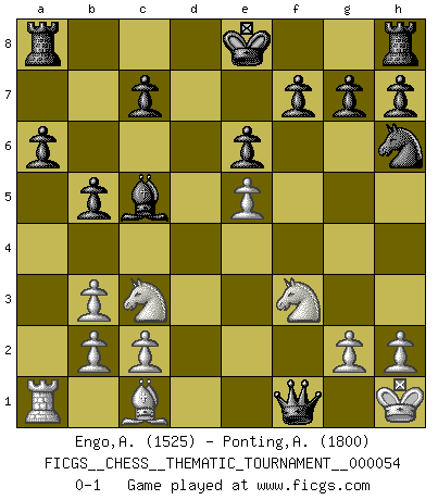 Last move : 0-1 2008 August 15 10:6:57 [Event "FICGS__CHESS__THEMATIC_TOURNAMENT__000054"] [Site "FICGS"] [Date "2008.06.30"] [Round "1"] [White "Engo,Arne Sigvald"] [Black "Ponting,Andrew"] [Result "0-1"] [WhiteElo "1525"] [BlackElo "1800"] 1.e4 Nf6 2.e5 Ng8 3.d4 d6 4.f4 e6 5.Nf3 Nc6 6.Bb5 a6 7.Ba4 b5 8.Bb3 Bb7 9.O-O Nh6 10.Nc3 Na5 11.Ng5 Nxb3 12.axb3 dxe5 13.fxe5 Be7 14.Qh5 Qxd4+ 15.Rf2 Bc5 16.Qf3 Bxf3 17.Nxf3 Qxf2+ 18.Kh1 Qf1+ 0-1 Alekhine's defense : Brooklyn defense Kingside Castling by player White (move 9) Player Black won this chess game. Follow this game move after move (download)I have always a slight feeling of pity for the man who has no knowledge of Chess. (Siegbert Tarrasch) Obendrein hat der FIDE-Präsident den Revolutionsführer Gaddafi zum »Großmeister« ernannt, am Ende der WM. Das ist lächerlich! (Joel Lautier) Entre mas años cumplo, mas valoro los Peones. (Keres) Le système Elo représente seulement une moyenne. Il est simplement un indicateur de votre stabilité. (Anatoli Karpov) The ultimate in disposing one's troops is to be without ascertainable shape. Then the most penetrating spies cannot pry in nor can the wise lay plans against you. (Sun Tzu)