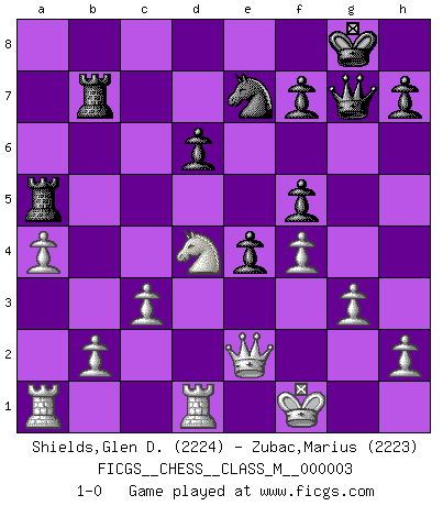 Last move : 1-0 2006 September 24 22:6:41 [Event "FICGS__CHESS__CLASS_M__000003"] [Site "FICGS"] [Date "2006.04.15"] [Round "1"] [White "Shields,Glen D."] [Black "Zubac,Marius"] [Result "1-0"] [WhiteElo "2224"] [BlackElo "2223"] 1.e4 c5 2.Nf3 Nc6 3.d4 cxd4 4.Nxd4 Nf6 5.Nc3 e5 6.Ndb5 d6 7.Bg5 a6 8.Na3 b5 9.Bxf6 gxf6 10.Nd5 f5 11.Bd3 Be6 12.O-O Bxd5 13.exd5 Ne7 14.Nxb5 Bg7 15.Nc3 e4 16.Be2 O-O 17.Qd2 Ng6 18.g3 Be5 19.Rab1 Qf6 20.f4 Bd4 21.Kg2 Rfe8 22.Rfd1 Bf2 23.Bc4 Rec8 24.Qe2 Bd4 25.Bxa6 Rc5 26.Bb7 Rb8 27.Nb5 Rxb7 28.Nxd4 Rxd5 29.c3 Ra5 30.Ra1 Qg7 31.Kf1 Ne7 32.a4 1-0 Sicilian : Pelikan (Lasker/Sveshnikov) variation Kingside Castling by player White (move 12) Kingside Castling by player Black (move 16) Player White won this chess game. Follow this game move after move (download)First-class players lose to second class players because second-class players sometimes play a first-class game. (Tarrasch) Garry Kasparov war erst in der Großmeister-Organisation GMA, dann in der Profischach-Vereinigung PCA, zum Schluss kehrte er wieder in den Schoß der FIDE zurück. Aber gut, manche Leute sind flexibel (Viswanathan Anand) El Rey es una pieza de pelea. ¡Usenlo!. (Wilhelm Steinitz) Les Echecs sont et restent toujours un combat, un combat intégral comme la boxe, la lutte ou un autre sport, et où il doit y avoir un vainqueur et un vaincu. (Joseph Emil Diemer) All the biggest technological inventions created by man - the airplane, the automobile, the computer - says little about his intelligence, but speaks volumes about his laziness. (Mark Kennedy)
