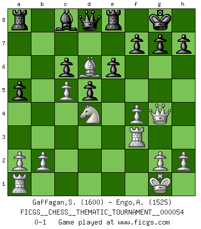 Last move : 0-1 2008 October 13 23:22:30 [Event "FICGS__CHESS__THEMATIC_TOURNAMENT__000054"] [Site "FICGS"] [Date "2008.06.30"] [Round "1"] [White "Gaffagan,Steven"] [Black "Engo,Arne Sigvald"] [Result "0-1"] [WhiteElo "1600"] [BlackElo "1525"] 1.e4 Nf6 2.e5 Nd5 3.d4 e6 4.c4 Nb6 5.Nc3 c6 6.Nf3 d5 7.exd6 Bxd6 8.c5 Bxc5 9.dxc5 Nd5 10.Nxd5 cxd5 11.Bb5+ Nc6 12.O-O a6 13.Bxc6+ bxc6 14.Bf4 O-O 15.Bd6 Re8 16.Nd4 Bb7 17.f4 a5 18.Qg4 Ba6 19.Rf3 Bc8 0-1 This chess game has been lost on time (started : 2008.06.30 20:43:42) Alekhine's defense Kingside Castling by player White (move 12) Kingside Castling by player Black (move 14) Player Black won this chess game. Follow this game move after move (download)A great player and a great example for many. His book My 60 Memorable Games had a big impact on me. It is a shame he didn't continue to enrich the world of chess with his unparalleled understanding after 1972. (Jan Timman, about Bobby Fischer's death) Nach Morphy wurde nichts neues mehr in der Behandlung offener Positionen gefunden. (Mikhail Moiseyevich Botvinik) La vida es como el Ajedrez, con lucha, competición y eventos buenos y malos. (Benjamin Franklin) Les échecs, c'est l'imagination. (David Bronstein) The problem with troubleshooting is that trouble shoots back. (Anonymous)