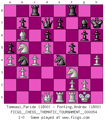 Last move : 1-0 2008 October 18 13:41:39 [Event "FICGS__CHESS__THEMATIC_TOURNAMENT__000054"] [Site "FICGS"] [Date "2008.06.30"] [Round "1"] [White "Tommasi,Paride"] [Black "Ponting,Andrew"] [Result "1-0"] [WhiteElo "1800"] [BlackElo "1800"] 1.e4 Nf6 2.e5 Nd5 3.d4 d6 4.Nf3 Nb6 5.a4 a5 6.Nc3 g6 7.exd6 cxd6 8.Bb5+ Bd7 9.h4 h6 10.Bf4 Bg7 11.Qd2 Bxb5 12.Nxb5 Nc6 13.O-O Nd5 14.Bh2 O-O 15.c4 Nf6 16.d5 Nb4 17.Rae1 Rc8 18.b3 Qd7 19.Bf4 Kh7 20.Be3 Ne4 21.Qd1 f5 22.Bb6 1-0 Alekhine's defense : Modern, Schmid variation Kingside Castling by player White (move 13) Kingside Castling by player Black (move 14) Player White won this chess game. Follow this game move after move (download)You can only get good at Chess if you love the game. (Bobby Fischer) Schach ist eine Sache der genauen Beurteilung, wann man zuschlagen und wann man sich ducken muss. (Robert James Fischer) Aún deseo matar a Fischer. (Boris Spassky) Comme les marins qui ont mille raisons différentes d'aller en mer, les joueurs d'échecs en ont tout autant avant de s'installer devant une table et jouer... (Vincent Bertignac, philosophe) Art is not a thing, it is a way. (Elbert Hubbard)