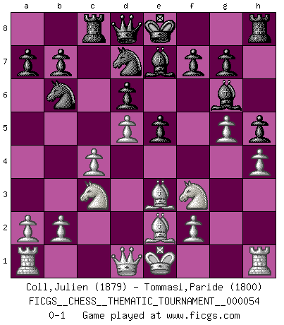 Last move : 0-1 2008 November 9 2:15:12 [Event "FICGS__CHESS__THEMATIC_TOURNAMENT__000054"] [Site "FICGS"] [Date "2008.06.30"] [Round "1"] [White "Coll,Julien"] [Black "Tommasi,Paride"] [Result "0-1"] [WhiteElo "1879"] [BlackElo "1800"] 1.e4 Nf6 2.e5 Nd5 3.d4 d6 4.Nf3 Bg4 5.Be2 e6 6.h3 Bh5 7.c4 Nb6 8.exd6 cxd6 9.Nc3 Be7 10.d5 e5 11.g4 Bg6 12.h4 h5 13.g5 N8d7 14.Be3 Rc8 0-1 Alekhine's defense : Modern variation, 4...Bg4 Player Black won this chess game. Follow this game move after move (download)A bad day of Chess is better than any good day at work. (Anonymous) Ich würde mich als ganz normalen Jungen bezeichnen [Im Alter von 12]. (Sergej Karjakin) Para mi, el Ajedrez es la vida y cada partida es como una nueva vida. Todo jugador de Ajedrez suele vivir muchas vidas durante su vida. (Eduard Gufeld) Avec des compensations pour le matériel en plus... (Anonyme) A belief is an idea the mind possesses, an idea that possesses the mind. (Robert Oxden Bolton)