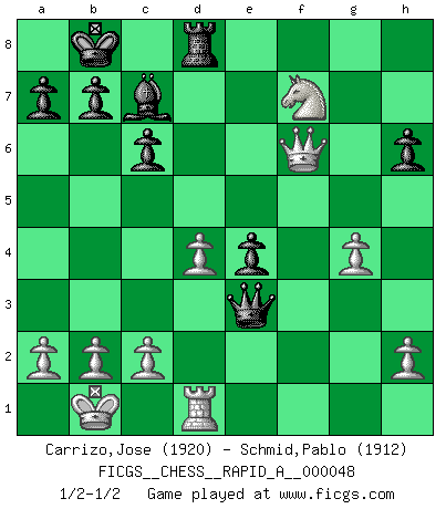 Last move : 1/2-1/2 2008 August 18 8:19:31 [Event "FICGS__CHESS__RAPID_A__000048"] [Site "FICGS"] [Date "2008.07.01"] [Round "1"] [White "Carrizo,Jose"] [Black "Schmid,Pablo"] [Result "1/2-1/2"] [WhiteElo "1920"] [BlackElo "1912"] 1.e4 e5 2.Nf3 Nc6 3.Bb5 f5 4.Nc3 fxe4 5.Nxe4 d5 6.Nxe5 dxe4 7.Nxc6 Qg5 8.Qe2 Nf6 9.f4 Qxf4 10.Ne5 c6 11.d4 Qh4+ 12.g3 Qh3 13.Bc4 Be6 14.Bg5 O-O-O 15.O-O-O Bd6 16.Rhf1 Rhf8 17.g4 Bxc4 18.Qxc4 h6 19.Bxf6 Rxf6 20.Rxf6 gxf6 21.Qe6+ Kc7 22.Qf7+ Kb8 23.Qxf6 Qe3+ 24.Kb1 Bc7 25.Nf7 Re8 26.Nd6 Rd8 27.Nf7 1/2-1/2 Ruy Lopez : Schliemann defense, Berger variation Queenside Castling by player Black (move 14) Queenside Castling by player White (move 15) This chess game ended in a draw. Follow this game move after move (download)Chess is the art of analysis. (Mikhail Botvinnik) Frage des Reporters: -Welche besonderen Umstände rechtfertigen das Anhalten der Uhren während einer Turnierpartie? Antwort: -Einen Fotographen zu strangulieren. (Siegbert Tarrasch) Un jugador que es sorprendido, esta derrotado a medias. (Proverbio) Toutes les manuvres exécutées sur une colonne ouverte ont pour but ultime l'intrusion définitive sur la septième ou la huitième rangée, en plein cur de la position ennemie. (Aaron Nimzovitch) It is the aim of the modern school, not to treat every position according to one general law, but according to the principle inherent in the position. (Richard Reti)