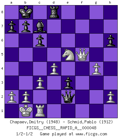 Last move : 1/2-1/2 2008 August 23 19:51:38 [Event "FICGS__CHESS__RAPID_A__000048"] [Site "FICGS"] [Date "2008.07.01"] [Round "1"] [White "Chapaev,Dmitry"] [Black "Schmid,Pablo"] [Result "1/2-1/2"] [WhiteElo "1948"] [BlackElo "1912"] 1.e4 e5 2.Nf3 Nc6 3.Bb5 f5 4.Nc3 fxe4 5.Nxe4 d5 6.Nxe5 dxe4 7.Nxc6 Qg5 8.Qe2 Nf6 9.f4 Qxf4 10.Ne5 c6 11.d4 Qh4+ 12.g3 Qh3 13.Bc4 Be6 14.Bg5 O-O-O 15.O-O-O Bd6 16.Rhf1 Rhf8 17.g4 Bxc4 18.Qxc4 h6 19.Qe6+ Kc7 20.Bxf6 Rxf6 21.Rxf6 gxf6 22.Qf7+ Kb8 23.Qxf6 Qe3+ 24.Kb1 Bc7 25.c3 Qe2 26.Rc1 e3 27.Qf5 1/2-1/2 Ruy Lopez : Schliemann defense, Berger variation Queenside Castling by player Black (move 14) Queenside Castling by player White (move 15) This chess game ended in a draw. Follow this game move after move (download)A thorough understanding of the typical mating continuations makes the most complicated sacrificial combinations leading up to them not only not difficult, but almost a matter of course. (Siegbert Tarrasch) Ein Großmeister muß tausende Partien in seinem Kopf speichern, denn diese sind für Ihn, was die Worte der Muttersprache für gewöhnliche Leute sind, oder Noten für Musiker... (Garry Kasparov) Aún el Rey más flojo huye despavorido ante la amenaza de un Jaque doble. (Aaron Nimzowitsch) Donnez-moi un Cavalier en 6e et je gagnerais toutes mes parties. (Steinitz) A generalist learns less and less about more and more until he knows nothing about everything. (Author unknown)