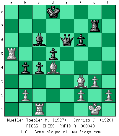 Last move : 1-0 2008 November 11 20:53:17 [Event "FICGS__CHESS__RAPID_A__000048"] [Site "FICGS"] [Date "2008.07.01"] [Round "1"] [White "Mueller-Toepler,Michael"] [Black "Carrizo,Jose"] [Result "1-0"] [WhiteElo "1927"] [BlackElo "1920"] 1.d4 d5 2.c4 e6 3.Nc3 c6 4.Nf3 Nf6 5.Bg5 dxc4 6.e4 b5 7.e5 h6 8.Bh4 g5 9.Nxg5 hxg5 10.Bxg5 Nbd7 11.exf6 Bb7 12.g3 c5 13.d5 Qb6 14.Bg2 O-O-O 15.O-O b4 16.Na4 Qb5 17.a3 exd5 18.axb4 cxb4 19.Be3 Nc5 20.Qg4+ Rd7 21.Qg7 Bxg7 22.fxg7 Rg8 23.Nxc5 Rxg7 24.Nxd7 Qxd7 25.Rxa7 f6 26.Rc1 Qe6 27.Ra5 Kd8 28.Bd4 Bc6 29.Bf3 1-0 This chess game has been lost on time (started : 2008.07.01 2:19:40) QGD : Semi-Slav Queenside Castling by player Black (move 14) Kingside Castling by player White (move 15) Player White won this chess game. Follow this game move after move (download)The battle for the ultimate truth will never be won. And that's why Chess is so fascinating. (Hans Kmoch) Bobby Fischer ist kein Vorbild für die heutige Jugend. (Viktor Kortschnoi) Una partida de Ajedrez se divide en 3 etapas: la primera cuando piensas que tienes la ventaja, la segunda cuando crees que tienes la ventaja y la tercera... ¡cuando te das cuenta que vas a perder!. (Savielly Tartakower) Même si l'adversaire joue le coup analysé précédemment, recommencez l'analyse en voyant la nouvelle position. Première règle de Blumenfeld It's not the will to win, but the will to prepare to win that makes the difference. (Bear Bryant)