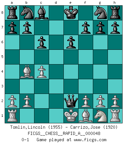 Last move : 0-1 2008 August 23 7:4:39 [Event "FICGS__CHESS__RAPID_A__000048"] [Site "FICGS"] [Date "2008.07.01"] [Round "1"] [White "Tomlin,Lincoln"] [Black "Carrizo,Jose"] [Result "0-1"] [WhiteElo "1955"] [BlackElo "1920"] 1.c4 e6 2.Nc3 d5 3.d4 c6 4.e4 dxe4 5.Nxe4 Bb4+ 6.Bd2 Qxd4 7.Bxb4 Qxe4+ 8.Qe2 Qxe2+ 0-1 This chess game has been lost on time (started : 2008.07.01 2:19:40) English Opening Player Black won this chess game. Follow this game move after move (download)Fischer Chess play was always razor-sharp, rational and brilliant. One of the best ever. (Dave Regis) Es gibt keine einzige Frau, der ich nicht einen Springer vorgeben könnte und trotzdem gewänne. (Robert James Fischer) Cuando le juegas a Fischer, no es una cuestion de si vas a ganar o perder. Es una cuestion de si vas a sobrevivir. (Boris Spassky) J'apprécie les joueurs d'est-indienne, c'est grâce à eux que je nourris ma famille depuis tant d'années. (Petrosian) Two beer, or not two beer. (Unknown)