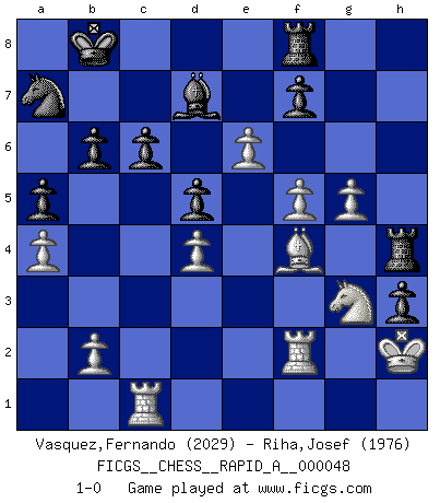 Last move : 1-0 2008 July 26 23:18:53 [Event "FICGS__CHESS__RAPID_A__000048"] [Site "FICGS"] [Date "2008.07.01"] [Round "1"] [White "Vasquez,Fernando"] [Black "Riha,Josef"] [Result "1-0"] [WhiteElo "2029"] [BlackElo "1976"] 1.e4 c6 2.d4 d5 3.e5 Bf5 4.Nc3 Qb6 5.Nf3 e6 6.Be2 Ne7 7.O-O Nd7 8.a4 a5 9.Nh4 h6 10.Ra3 Bh7 11.Rb3 Qa7 12.f4 g5 13.Nf3 Bg7 14.Be3 Nf5 15.Bf2 gxf4 16.Bd3 h5 17.Ng5 Bg6 18.h4 Bh6 19.Ne2 Bxg5 20.hxg5 f3 21.gxf3 Nb6 22.Nf4 O-O-O 23.Qe1 Rde8 24.Qc3 Kc7 25.Qc5 Nc8 26.Qxa7 Nxa7 27.Rc1 Ne7 28.Be1 b6 29.Ba6 Nac8 30.c4 dxc4 31.Rxc4 h4 32.Kh2 Bf5 33.Bd2 Reg8 34.Rc1 h3 35.Ne2 Rh4 36.Rbc3 Na7 37.Bc4 Nd5 38.Bxd5 exd5 39.f4 Ra8 40.Ng3 Bd7 41.Rf3 Bg4 42.Rf2 Bd7 43.f5 Rf8 44.Bf4 Kb8 45.e6 1-0 Caro-Kann : Advance variation Kingside Castling by player White (move 7) Queenside Castling by player Black (move 22) Player White won this chess game. Follow this game move after move (download)Adequate compensation for a sacrifice is having a sound combination leading to a winning position; adequate compensation for a blunder is having your opponent snatch defeat from the jaws of victory. (Bruce A. Moon) Schach ist gnadenlos. Du mußt bereit sein zu töten. (Nigel Short) El Ajedrez es en su esencia, un juego. En su forma, un arte. Y en su ejecución, una ciencia. (Baron Tassilo) Tout change constamment, y compris dans le monde des Echecs. (Botvinnik) The general who wins the battle makes many calculations in his temple before the battle is fought. The general who loses makes but few calculations beforehand. (Sun Tzu)